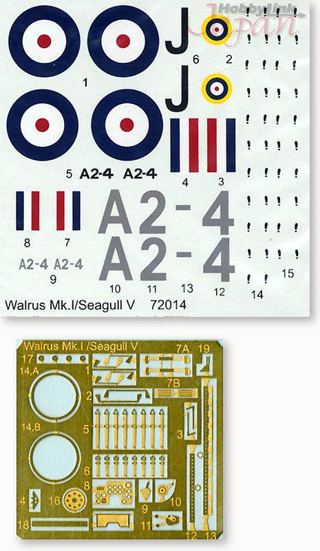 The all-wood Seagull I was first produced in 1922, but by the time the Seagull V appeared, it had been given an all-metal hull and stainless steel wing spars. Powered by a 625hp engine spinning a pusher-prop, the aircraft was deployed by the British Royal Navy in 1936, after having its structures reinforced for catapult launch and being renamed the Walrus Mk. I. These aircraft served throughout the war, and some continued flying even after. Valom's kit of the Seagull V features recessed panel lines and fine molding throughout. Well-molded resin parts and a nice fret of photo-etched parts round out the details. Markings for one Seagull V and one Walrus Mk. I are also included.