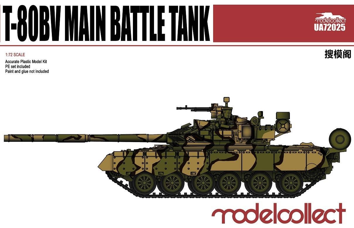 Detailed 1/72 kit of the T-80BV Main Battle Tank . Kit comes with parts molded in grey plastic and includes photo-etched detail parts, and tan colored rubber tracks.