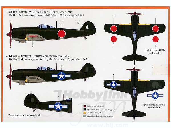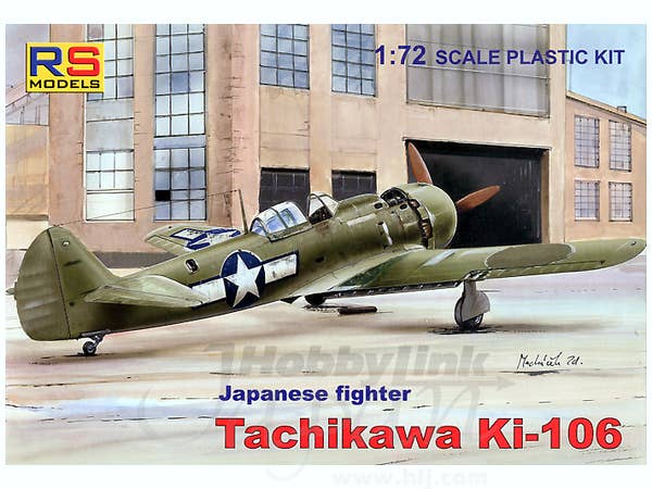 The Tachikawa Ki-106 was a prototype fighter developed late in the war to make use of non-strategic materials. Basically, it was a wooden Ki-84, retaining the lines of the original but being much heavier. Only a couple of prototypes were built before the war ended. This boxing has markings for two "what if" schemes, a home defense IJA aircraft and a Manchurian aircraft.