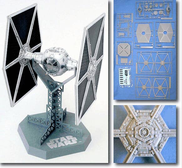 A reissue of Fine Molds outstanding 1/72 TIE Fighter kit with new box art designed to complement the DVD release of the first three movies in the Star Wars series. DVD not included! Not only is the detail of the kit absolutely brilliant, but they've gone out of their way to make this as easy to build as possible, even if you've never built a plastic model before. Note how the outer panels and the inner spokes are formed from separate parts -- this means you won't have to do any masking to paint the kit correctly! Just spray or brush gray and black paint on the appropriate parts, complete assembly, and then apply an easy black or dark gray wash to the kit (click here how if you're not familiar with this simple modeling technique) to get the amazing panel line and detail relief seen here. A must for any Star Wars fan!