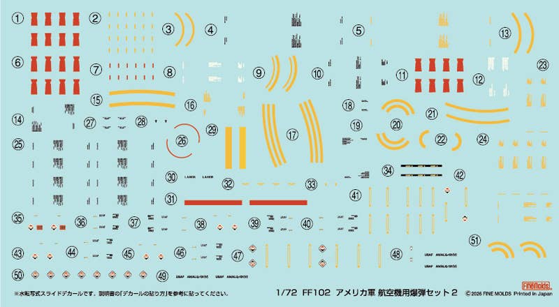 This 1/72-scale set from Fine Molds recreates essential U.S. Air Force weaponry without compromise! Using completely new molds, various laser-guided bombs, JDAMs (Joint Precision Attack Munitions), and Maverick air-to-surface missiles are accurately recreated. Additionally, three types of ECM pods for electronic warfare are included. This expanded armament selection allows for a wider range of options for each aircraft. Ideal for adding armaments to the simultaneously-announced F-14A Bombcat. The expanded bomb selection faithfully recreates actual combat specifications. Compatible with F-4, F-15, F-16, F/A-18, A-10, F-3, and more. Ideal as an accessory for modern fighter jets -- order yours today!