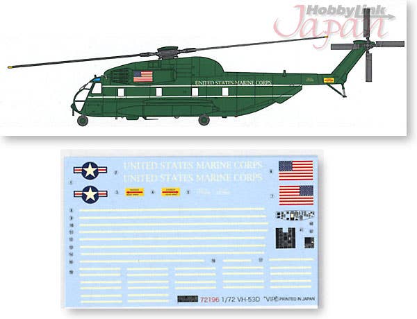 Fujimi's VH-53 VIP helo kit is a re-release of their fine CH-53 with VH-53 markings included to make this special VIP version of the rugged Sea Stallion. The kit is sharply molded in light gray styrene featuring recessed panel lines, pilot and copilot figures, and rotor blades that are as straight as boards (you'll need to warp them either down or up, depending on whether you're depicting your model parked or in flight). An interesting variation for your 1/72 helo collection!