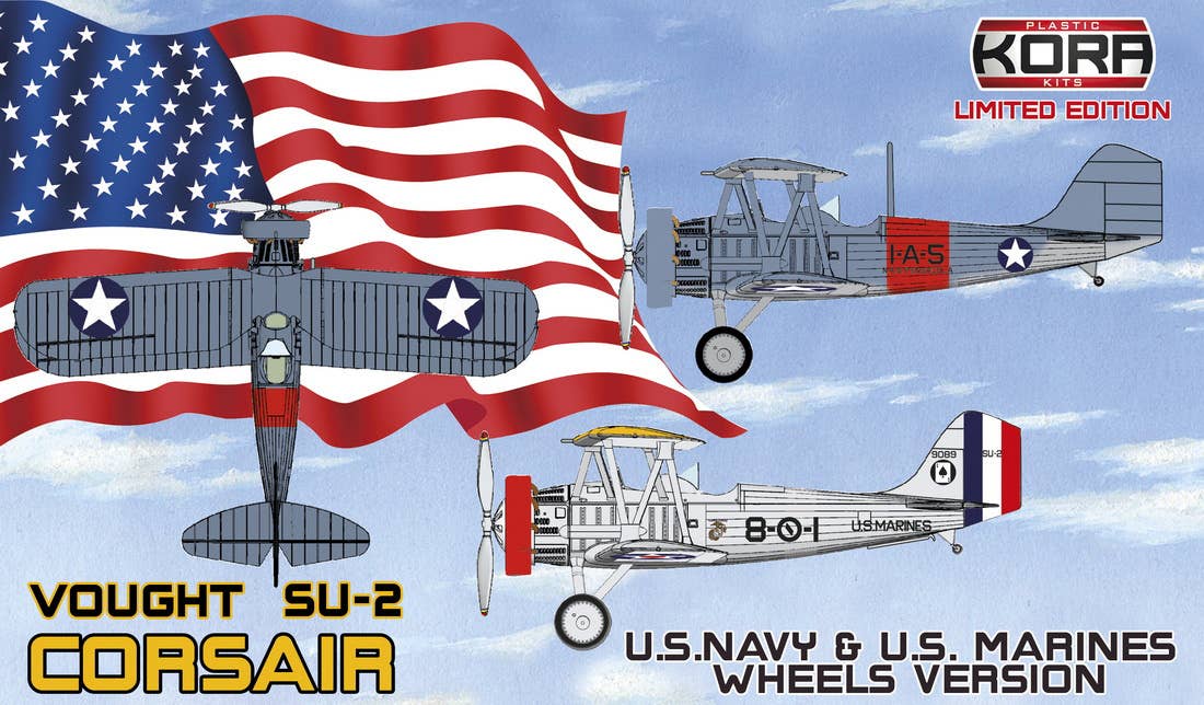 Kora Models brings us a completely new 1/72-scale model kit of the Vought SU-2 Scout Corsair! The Vought O3U/SU was a 1920s biplane observation and reconnaissance aircraft, the first to bear the company's Corsair name (the SBU was the second, the F4U the third, and the A-7 Corsair II the fourth). The O3U was available in both land and seaplane versions. The enhanced SU was designed for land use only due to its increased weight, and its mission was changed from observation to reconnaissance. Decals are included for three versions. Place your order today!