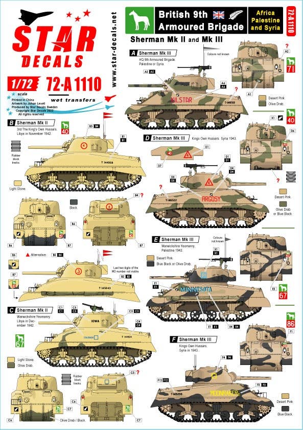 This is a set of beautifully printed water-slide decals for the Sherman Mk II and Mk III, by Star Decals. Order today!