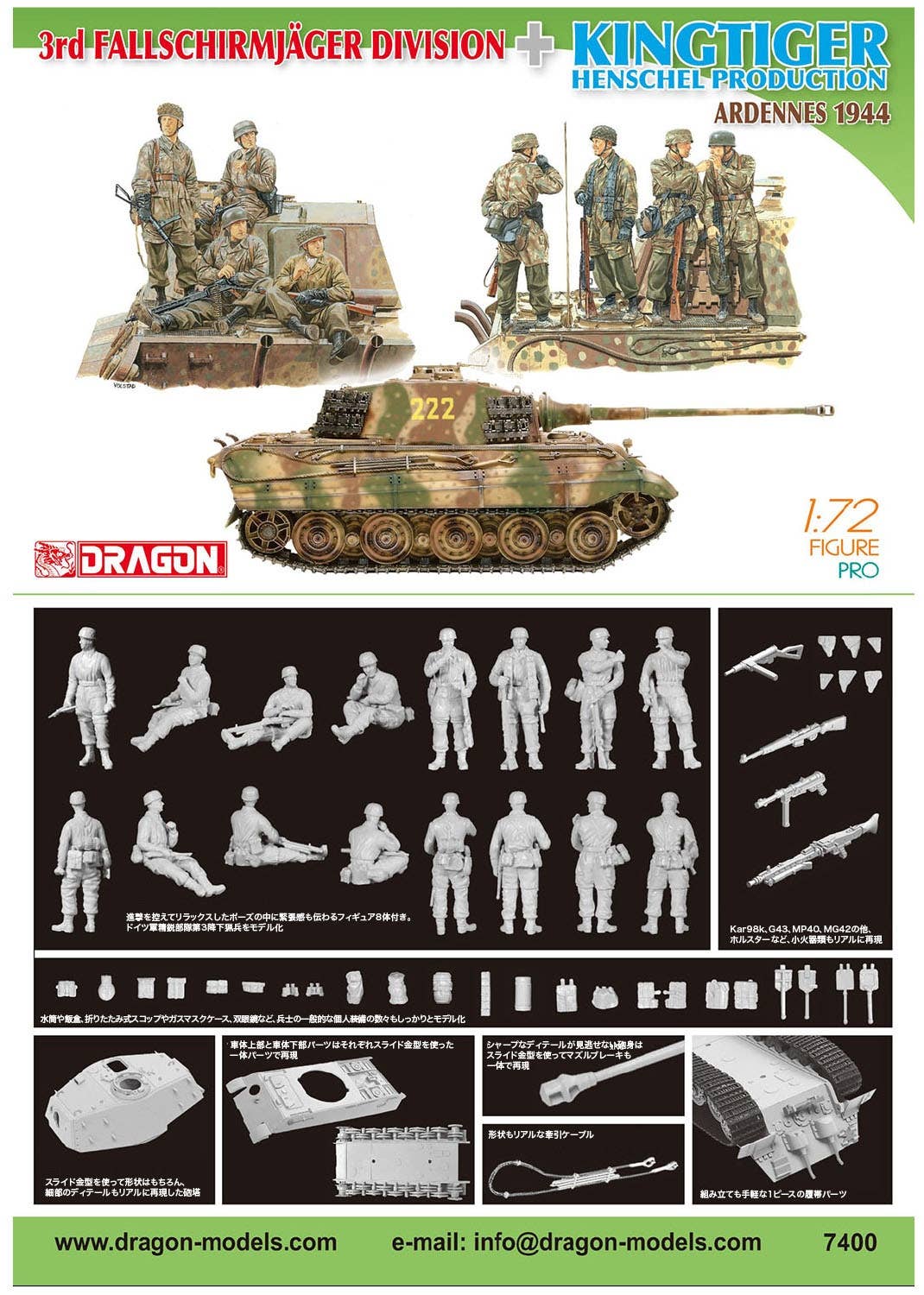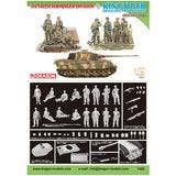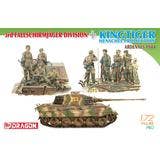 This model kit from Dragon combines the Piper Combat Team's King Tiger with the 3rd Parachute Division soldiers. The King Tiger features a Henschel turret with a long-barreled 88mm gun and inclined armor; the road wheels, sprocket wheels idler wheels and one-piece tracks are all accurately modeled. Eight soldiers from the 3rd Parachute Division are also included, with their unique helmets and uniforms as well as highly detailed equipment and weapons such as the MG42, Kar98, MP40, G43 and MP44. This kit is the perfect beginning to a diorama -- place your order today!