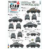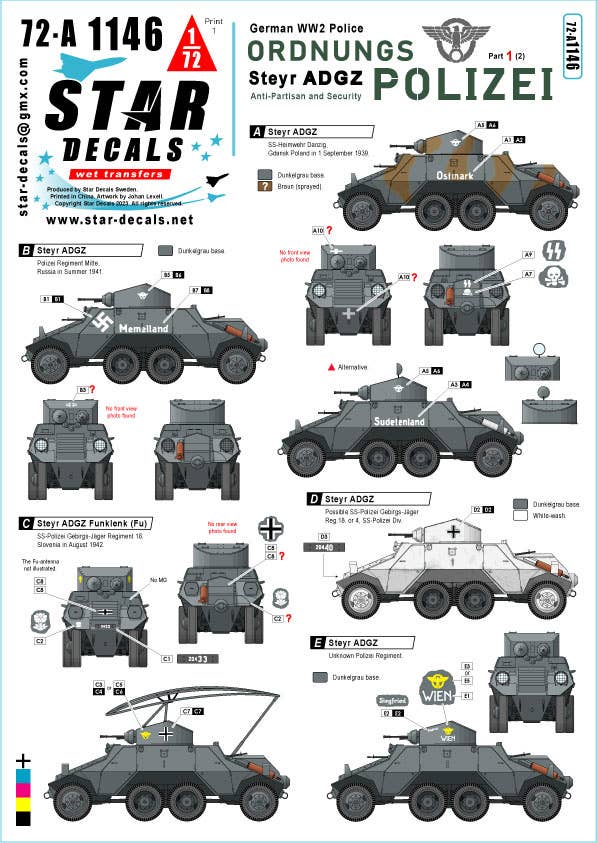 This decal set features markings for the Steyr ADGZ 8x8 armored car deployed by the German Order Police for counter-partisan and security duties during World War II. The set includes a total of 5 different types, including a radio communication vehicle. The Order Police (Ordnungspolizei) was an administrative organization primarily responsible for maintaining public order, handling criminal cases, and managing traffic accidents. Despite being a police force, it was ultimately overseen by Heinrich Himmler's SS and was slated to be absorbed into the security forces for prisoner management. This led to their well-equipped status, akin to military forces, and the use of vehicles like the ADGZ 8x8 armored car.
