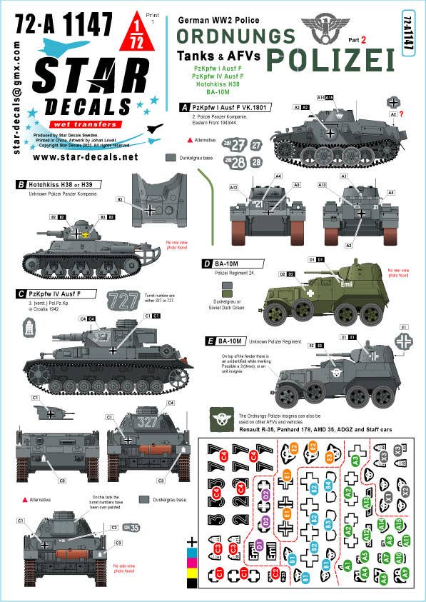 This decal set features markings for tanks and armored cars deployed by the German Order Police for counter-partisan and security duties during World War II. The set includes three tank types: I Panzer I Ausf.F, Hotchkiss H35/H39, and IV Panzer IV Ausf.F. Additionally, two types of armored cars, BA-10M 6x6 armored cars, are included, making a total of five options. The Panzer I Ausf.F has an optional variant with a different vehicle number.