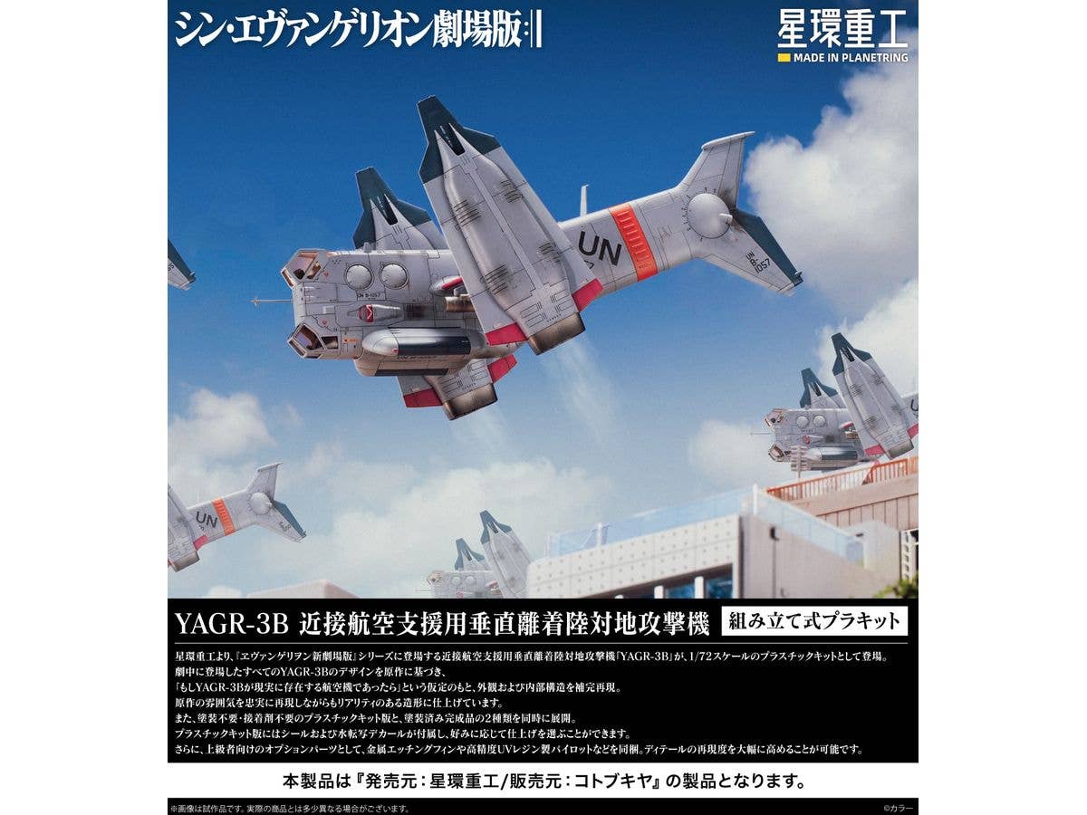 Seikan Heavy Industries provides us with a 1/72-scale plastic model kit of the YAGR-3B, a close air-support vertical takeoff and landing ground-attack aircraft featured in the "Rebuild of Evangelion" series! Based on the original design of all the YAGR-3B aircraft that appeared in the series, and under the premise of "what if the YAGR-3B were a real aircraft," the exterior and internal structures have been carefully reproduced for a highly realistic appearance! Waterslide decals and stickers are included so you can choose your preferred finish; this kit does not require glue or painting to complete. Optional parts for advanced modelers are also included, such as etched metal fins and high-precision UV resin pilots; these parts will significantly enhance the level of detail. The unique base is included to display it in flight. Place your order today!