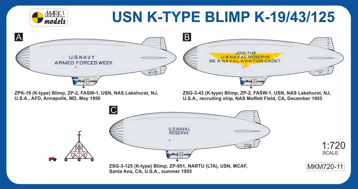 The K type of blimp were U.S. Navy soft airships built by Goodyear Aircraft Company. They did not have internal support structures, and were equipped with air-cooled engines on outriggers on the sides of the hull, located on the lower part of the cabin. Prior to World War II, 135 of these blimps were built and used for security networks and anti-submarine patrols due to their superior airworthiness, low-altitude operational capability and low-speed power, and were deployed in anti-submarine missions over a wide area of the Atlantic and Pacific regions.