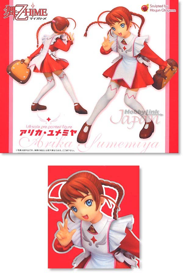 Adorable prepainted and completed PVC figure of Arika Yumemiya, from Mai Otome, in her 'school' uniform, carrying her back and giving you the victory sign and a smile! She comes mounted to a custom display base and is ready to show off, right out of the box. Please note that figures such as this are mass produced and as a result some inconsistencies in finish and painting may occur; these are not considered manufacturer's defects. If you absolutely must have perfection, prepare to do some touch-up work on your own.