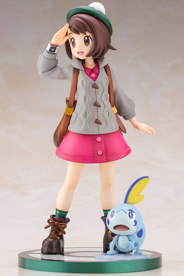 The latest duo to join Kotobukiya's series of Pokemon figures is Gloria with Sobble from "Pokemon Sword and Shield"! Based on an illustration by Hitoshi Ariga, Yuuri's posing perfectly captures the way she looks out over the vast landscape of the Galar Region. The texture of the leather Boston bag, the fluffiness of the knit hoodie, and the checkered pattern of the socks are all aspects that can only be seen in detail as a figure. The single tear trickling down from Sobble's eye and the puddle of tears is expressed with clear parts. Be sure to get your hands on this figure to enjoy all of the minute details of the figure!