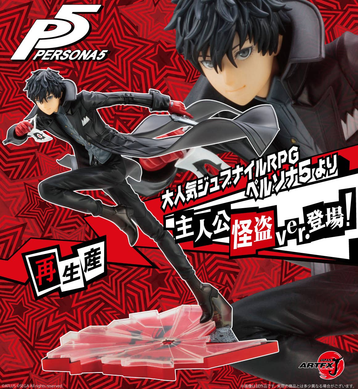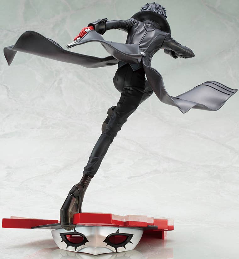 Ren Amamiya, the hero from "Persona 5," appears in his Phantom Thief disguise in a return to Kotobukiya's "ARTFX J" figure lineup! In full flight with his coattails aloft behind him, and his handgun in one hand and his mask in the other, he comes with a mask-themed base for display. Catch him for your own collection now!