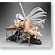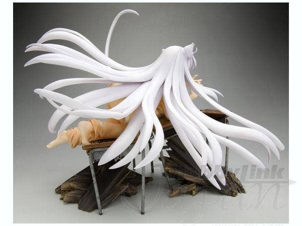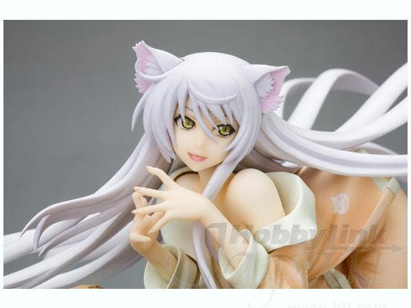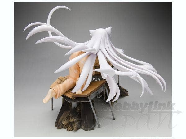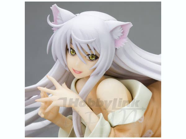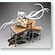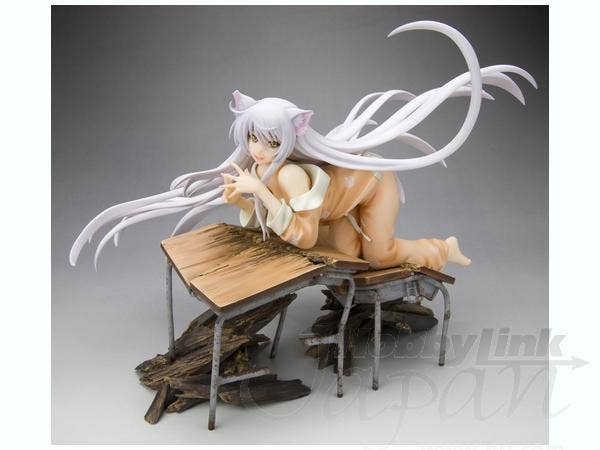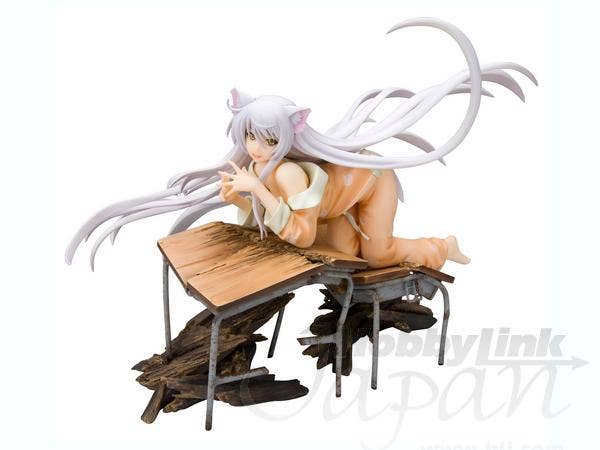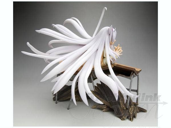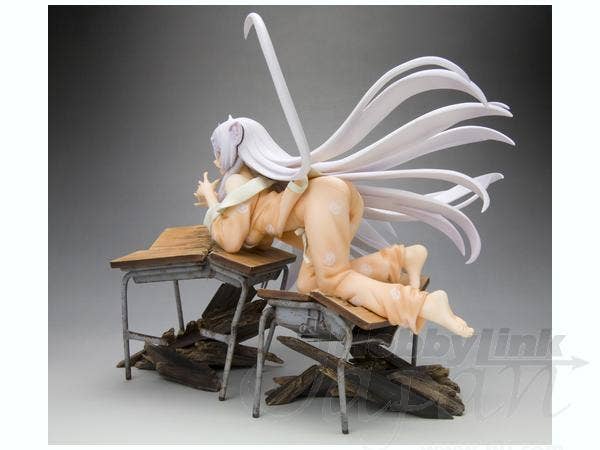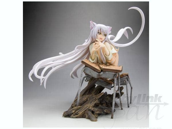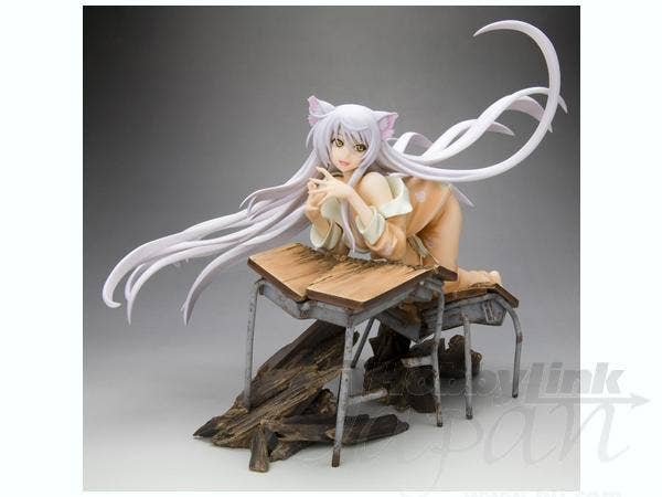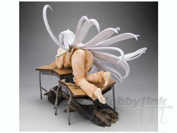 Black Hanekawa from "Bakemonogatari" has apparently just dropped through the ceiling to land on these poor unfortunate school desks, pretty much destroying them--and of course, just like a cat, she looks very pleased with herself for this! She's about 16cm long (measured from hands to toes only), and she was masterfully sculpted by Yusuke Masaki of Sakurazensen. Take her home with you now!