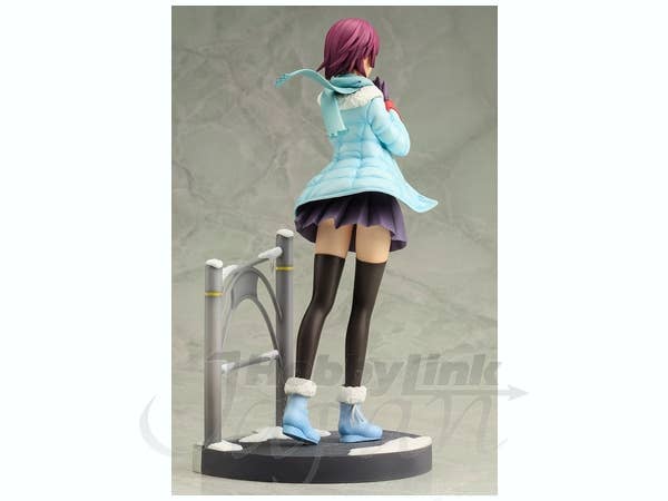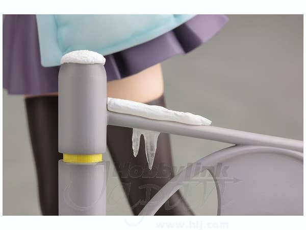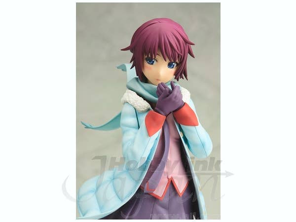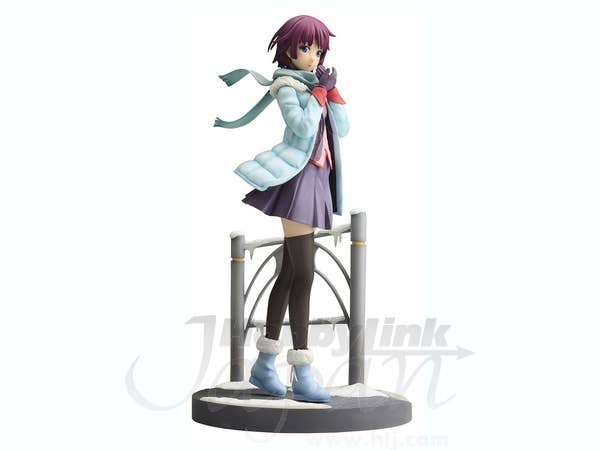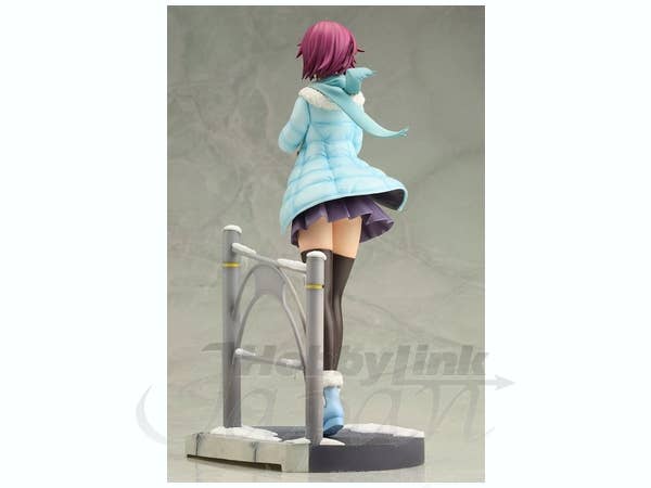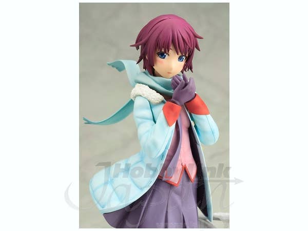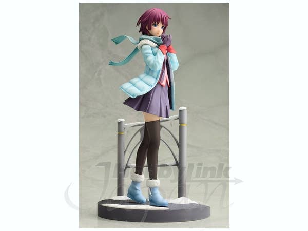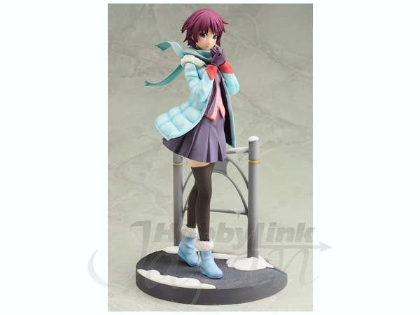 From the "Monogatari" series, Hitagi Senjougahara shows us her softer side in this lovely figure by Kotobukiya! Hitagi's primarily purple and pink theme gets a splash of light blue as she dresses warmly for the winter season, and the colors couldn't suit her better! The wind blowing back her scarf and the snow around her fur boots complete this wintery theme, but Hitagi still looks warm and inviting, as if she's waiting in anticipation for someone to show up! She measures about 21cm tall on her base. Order now and give her a warm spot on your shelf!
