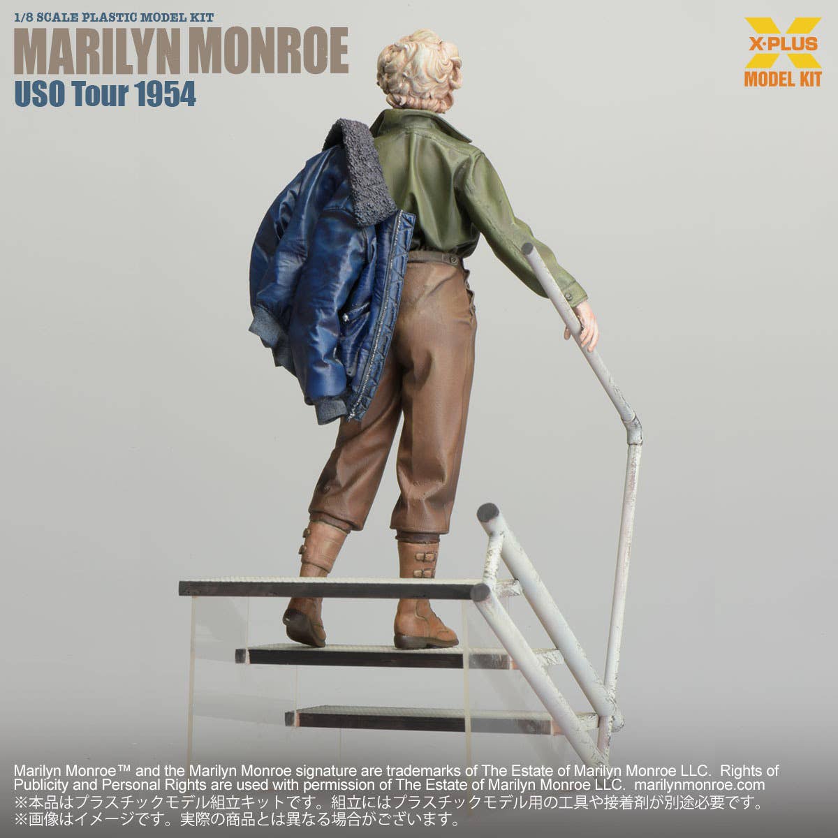 She's back! X Plus's 1/8-scale plastic model kit of the one-and-only Marilyn Monroe, as she was seen in 1954, disembarking from a C-54 transport plane that brought her to her first stop on a U.S.O. tour, is back! Instead of one of the glamorous costumes she typically wore onscreen, she wore military gear just like that of the U.S. soldiers she was visiting. Since it was bitterly cold, she wore a nylon B-15C jacket draped over her shoulders and a wool shirt. Her pants had buttons added to allow them to be tightened at the waist to highlight her feminine silhouette. This model kit accurately reproduces Marilyn's legendary proportions and lively facial expression, as well as the texture and wrinkles in her clothing. The kit will let you experience Marilyn's beauty and personality through the background of her times. Place your order today!
