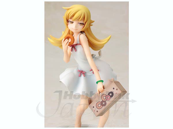 Shinobu Oshino from "Nisemonogatari" is happy as heck 'cause she's got a big box of her favorite thing in the whole world--donuts!  She also has a donut to hold in her right hand, and an interchangeable face with a crafty expression.  You can display her with or without her hat; a base is included too.  Add this little darling to your collection today!