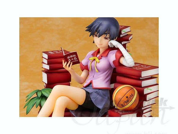 In a pose based on the illustration for the cover of "Bakemonogatari" Volume 3 DVD and Blu-Ray, Suruga Kanbaru sits at her ease on a throne made of books, with her favorite basketball right nearby. (In keeping with Suruga's slightly twisted interests, the books are bound volumes of "Barazoku," Japan's first magazine aimed at gay men--as is the slim volume in her hand!) This delightful vignette from Good Smile is about 15cm tall, and was sculpted by Hironori Tokunaga. She's ready to settle down in your collection!