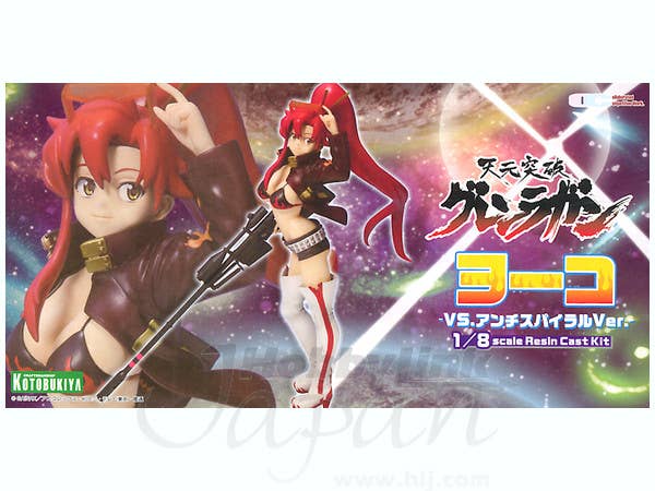 Sharpshooter Yoko stands ready with her sniper rifle in hand, preparing to take on the Anti-Spiral beings, while dressed in a skimpy bikini-style outfit with a pair of super-short hot pants, thigh-high boots, and a jacket--once you put her together! She comes in a total of 29 resin parts molded in white along with a color photograph of a completed Yoko model for color reference.