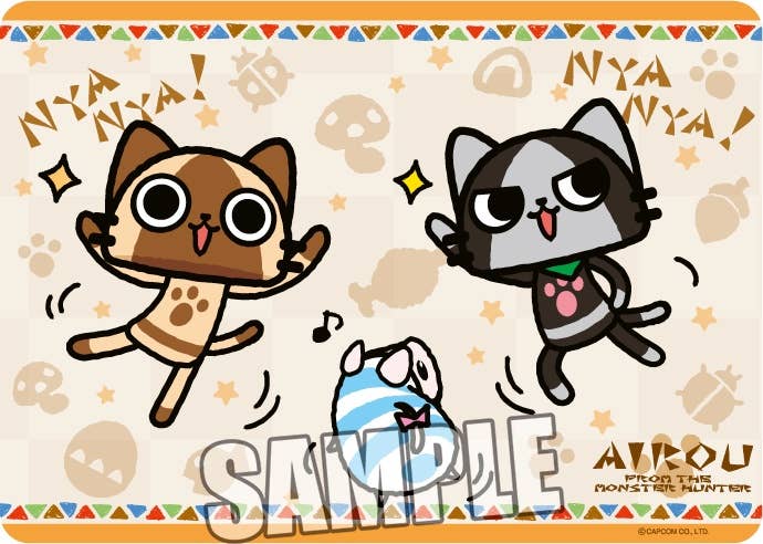 The cute mascots Airou and a Melynx (with bonus Poogie!) from "Monster Hunter" make this universal rubber mat something extra special! It's perfect for card games or for keeping the surface of your desktop neat and clean -- order yours now!
