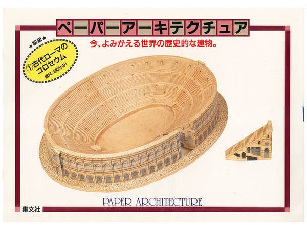 Build yourself an ancient Roman Colosseum -- out of paper! This papercraft book contains all the "parts" you'll need, printed on flexible cardstock, with fold lines noted. Instructions are in Japanese, but you should be able to follow the illustrations fairly easily with a little patience. 40 paper parts; you need to provide scissors, a hobby knife, white glue and clear tape. Finished length 35cm, width 28cm, height 6cm.