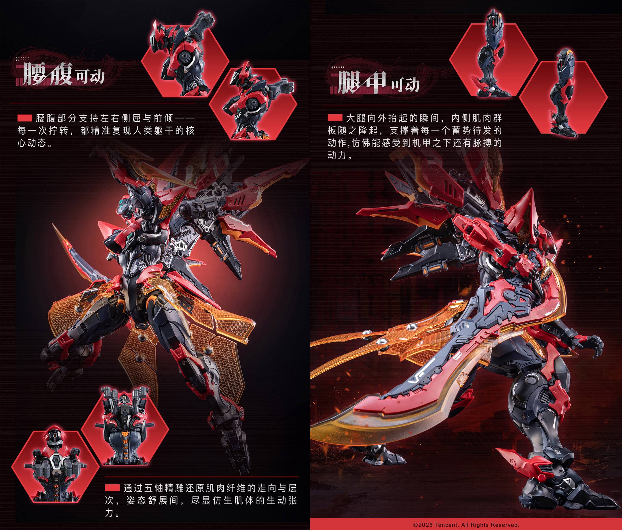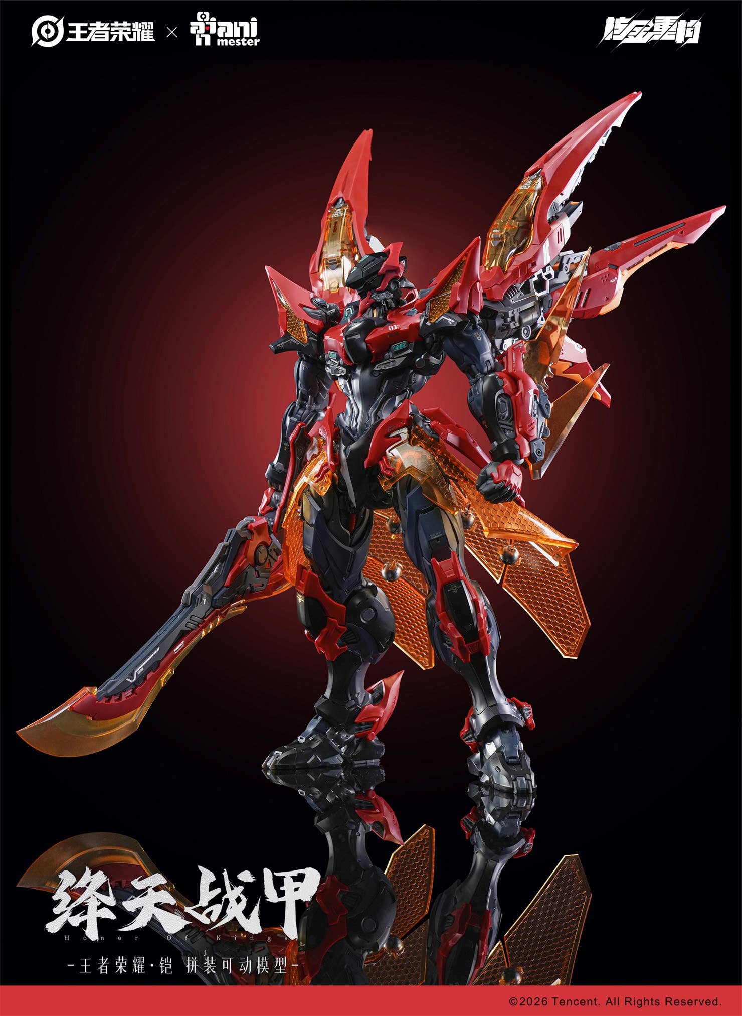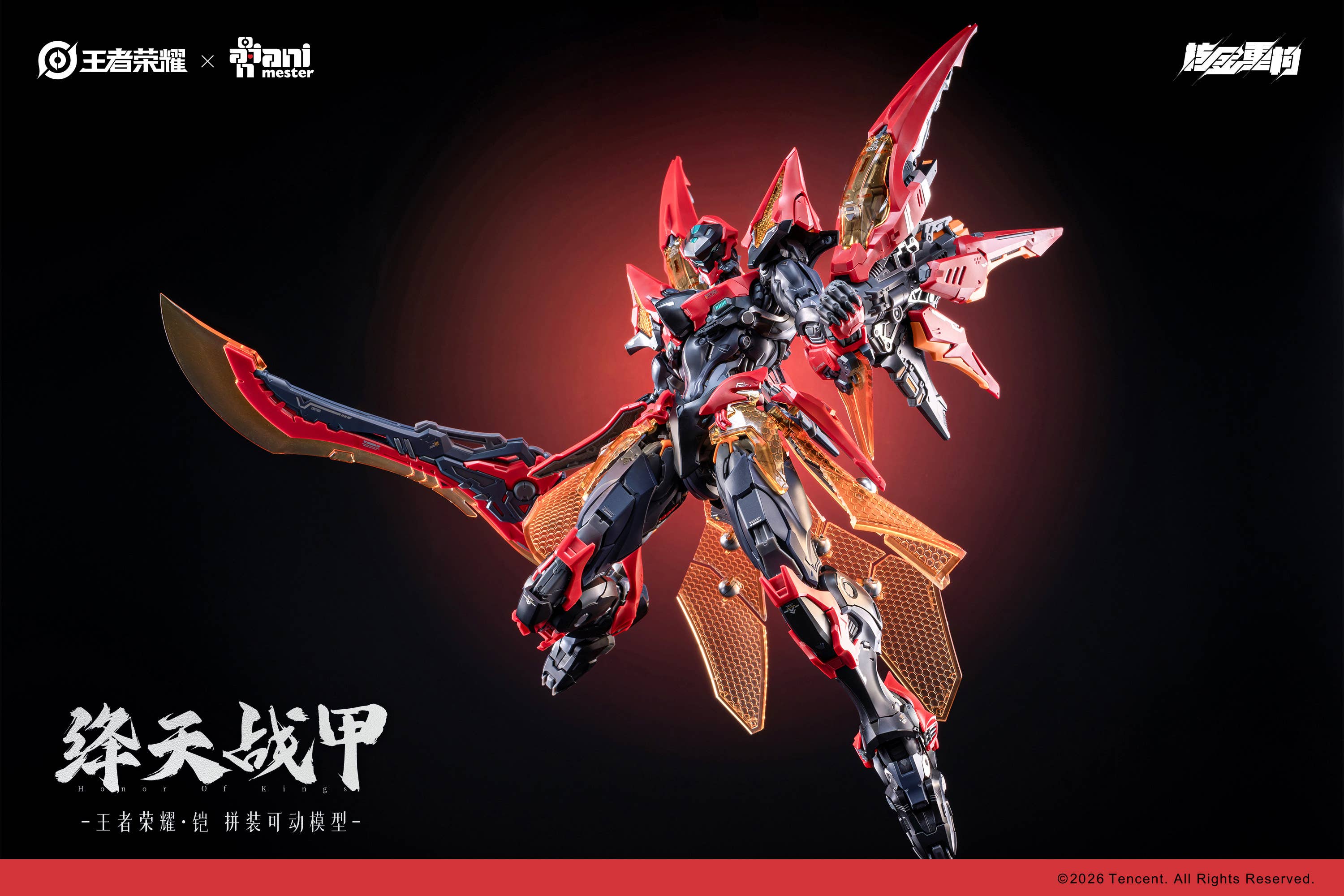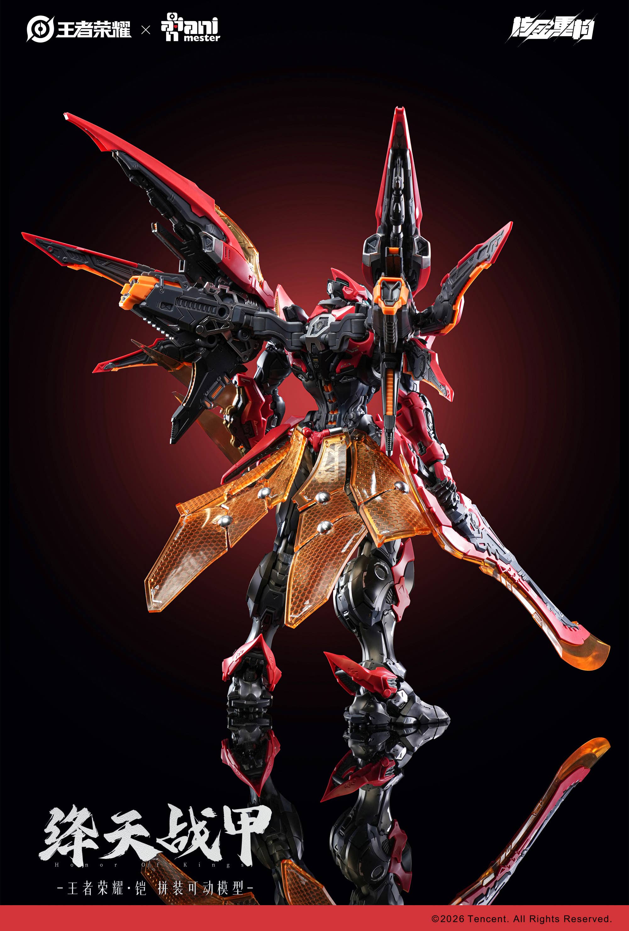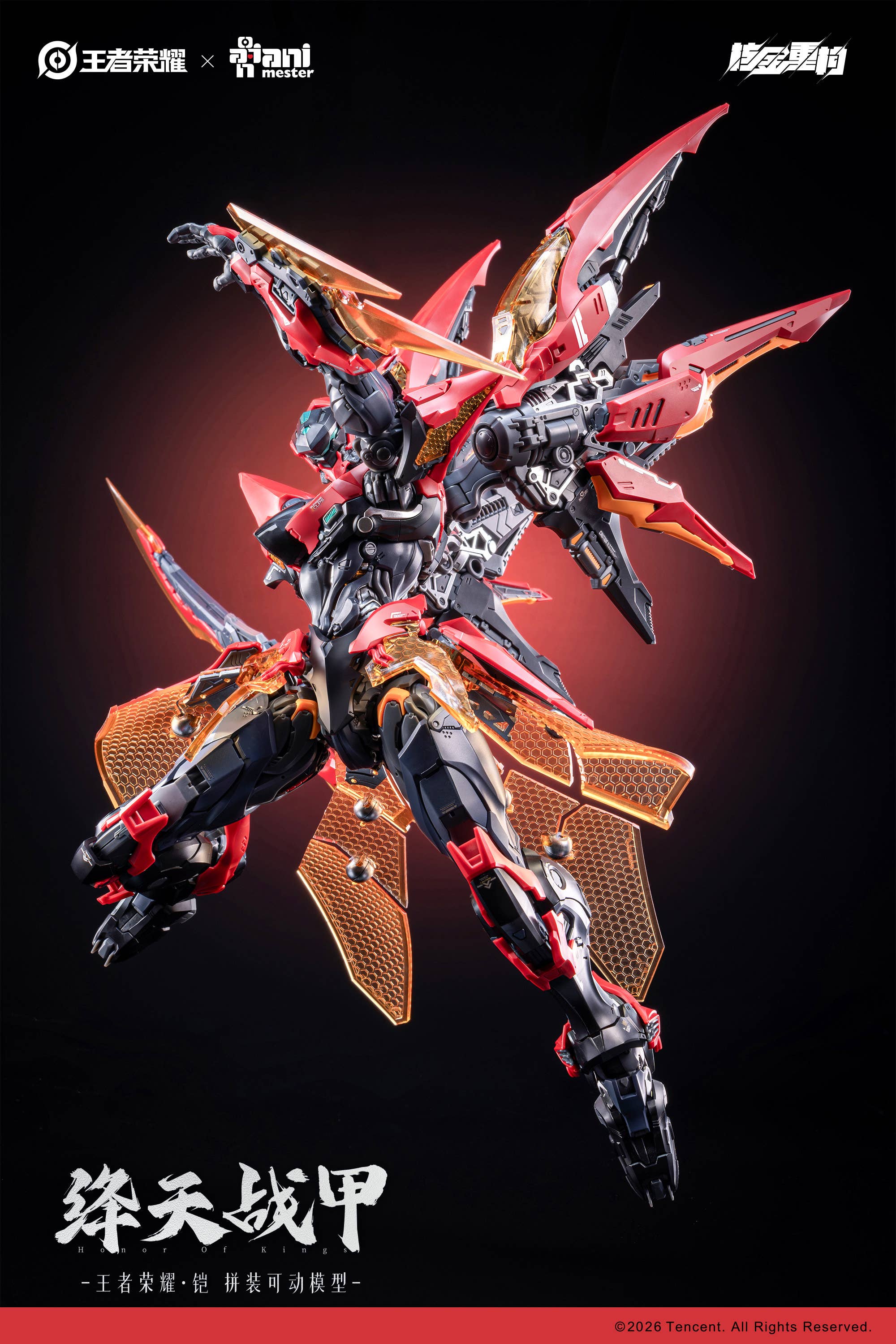 The character Kai from the popular game "Honor of Kings" makes his debut as a plastic model kit, featuring his Jiang Tian Zhan Jia Battle Armor skin! The model's internal frame features an intricate bionic design, incorporating numerous locking mechanisms. Not only does it faithfully recreate the lifelike textures that follow the contours of his musculature, but it also features delicate sculpting extending even to the frames of the arms and wings, further deepening the portrayal of Kai as a biomechanical life form.