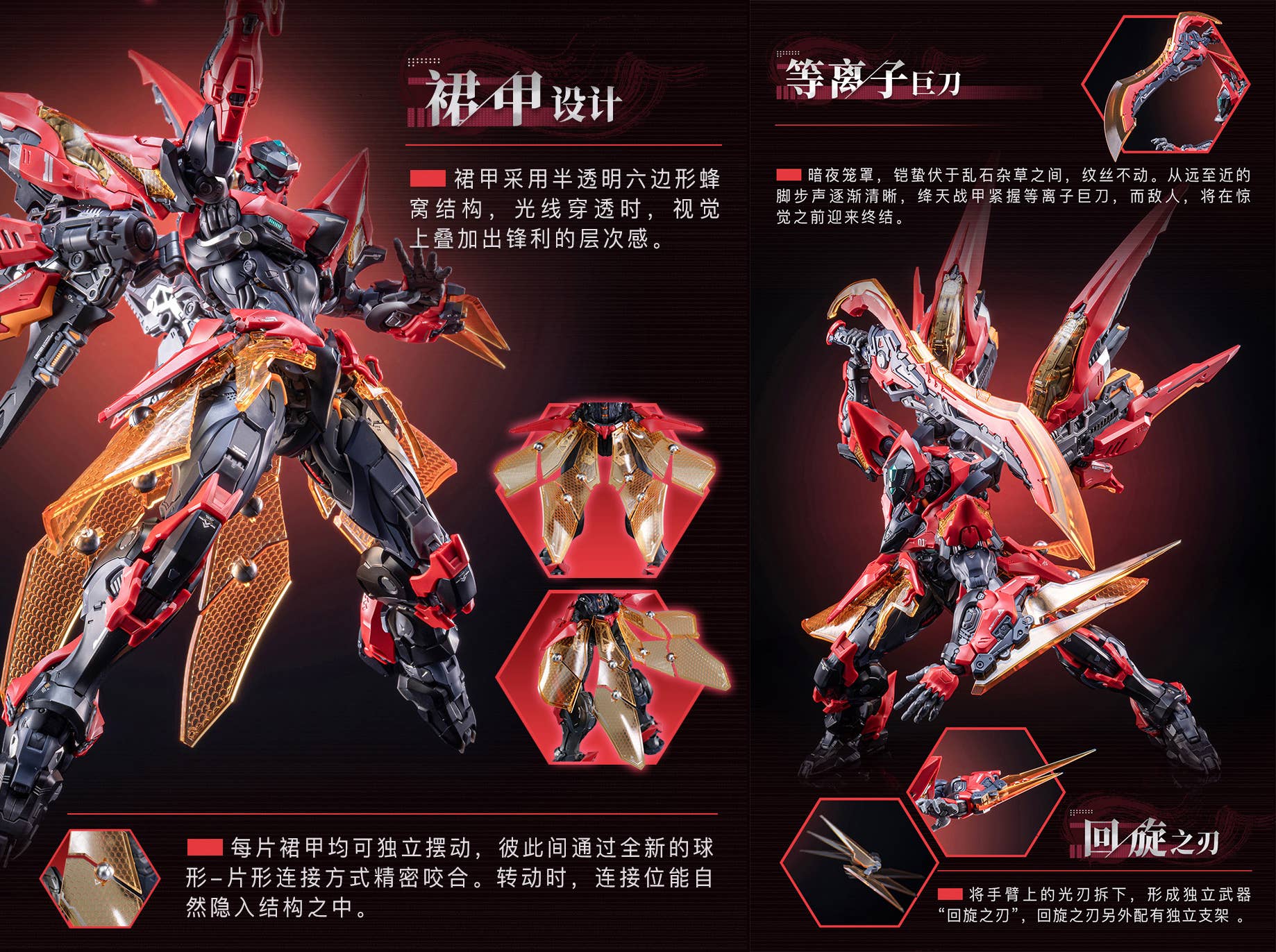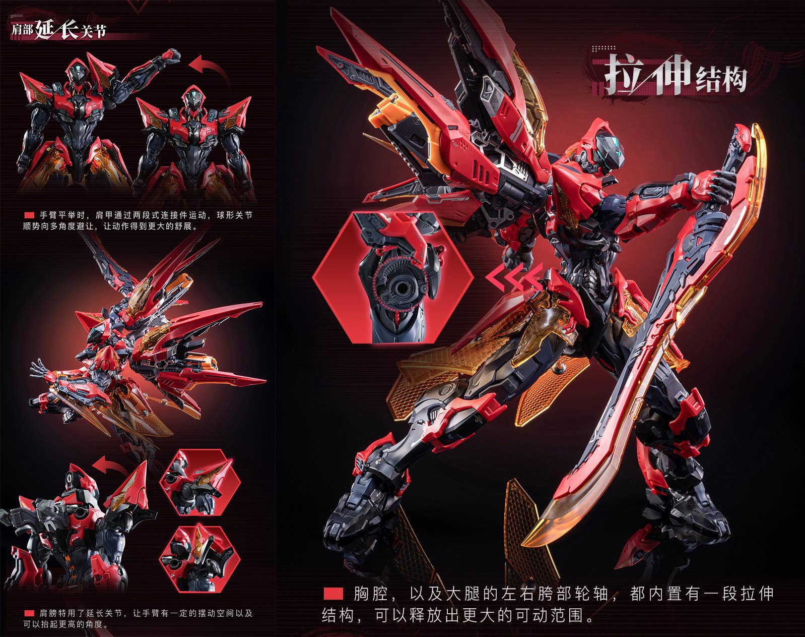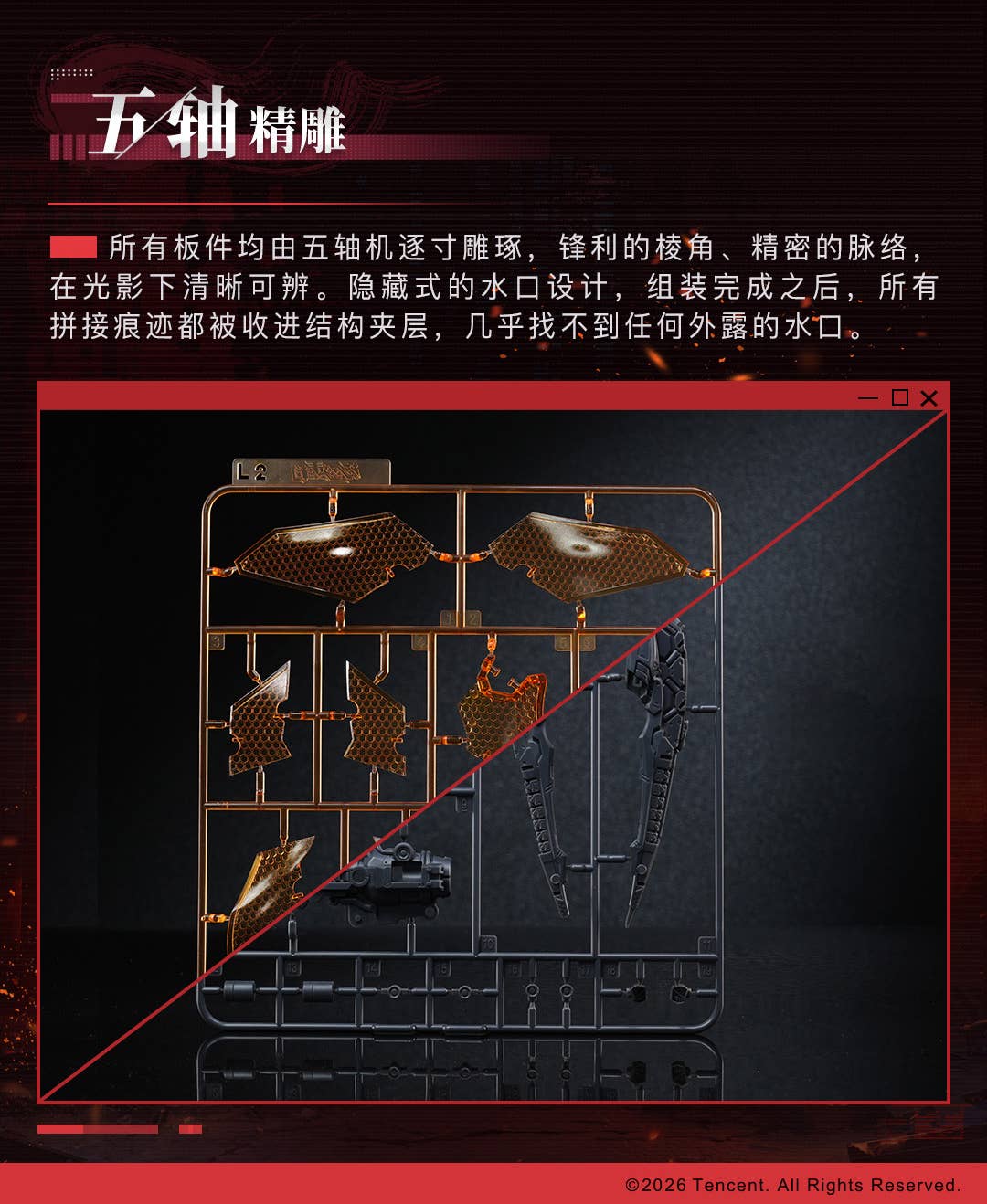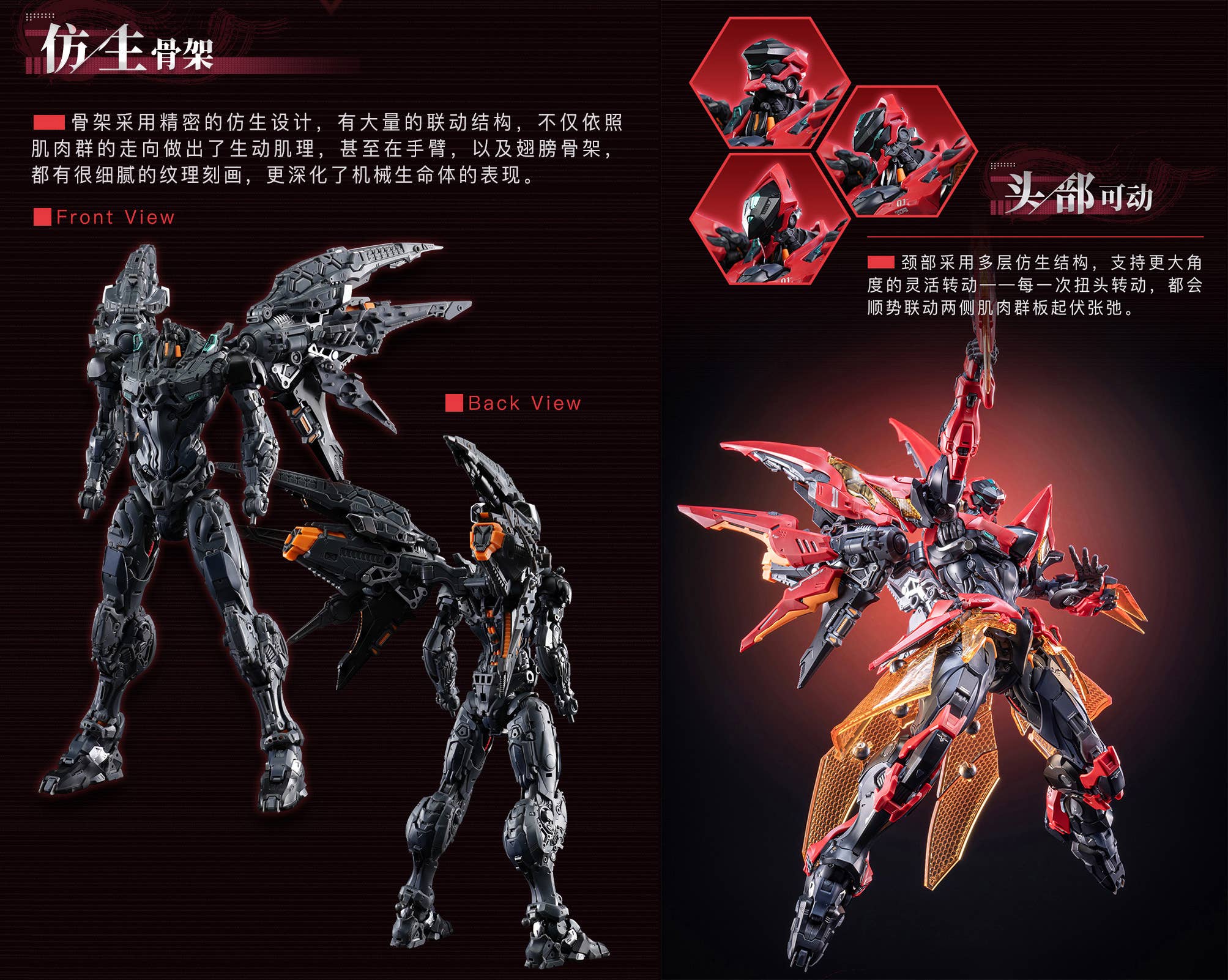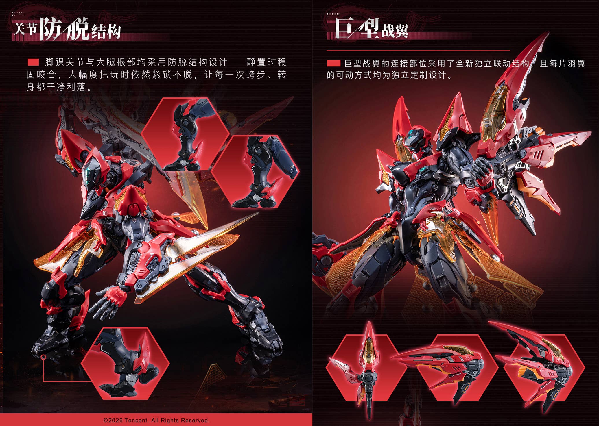 The character Kai from the popular game "Honor of Kings" makes his debut as a plastic model kit, featuring his Jiang Tian Zhan Jia Battle Armor skin! The model's internal frame features an intricate bionic design, incorporating numerous locking mechanisms. Not only does it faithfully recreate the lifelike textures that follow the contours of his musculature, but it also features delicate sculpting extending even to the frames of the arms and wings, further deepening the portrayal of Kai as a biomechanical life form.