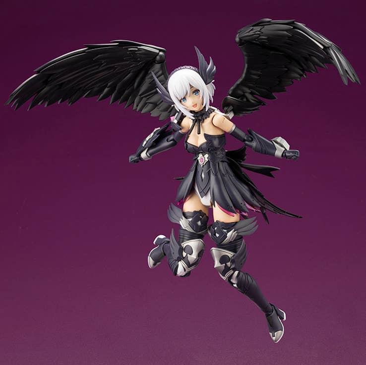 Lumitea returns to Kotobukiya's "Arcanadea" figure-kit series, this time with dark attributes, in contrast to her previous angelic appearance! She comes with four new tampo-printed facial expressions, and she can be built in her non-combat "Normal" mode, or her combat "Wilrise" mode. She's equipped with 3mm diameter joints so she's compatible with other items from the series. Her wings are placed in a position that doesn't disturb her lovely silhouette, achieving both a beautifully organic design and flexible mobility. The magic circle-shaped parts that serve as the connection base for the wings are hexagram-shaped joints with a 3mm hole in the center for added stability; they're also compatible with Hexa Gear items. Her upper arm and knee armor can be attached in various positions; her knees feature a drawer joint so she has beautiful leg lines and a wide range of movement. A bonus part of two hair runners is included, so you can choose your favorite color! Waterslide decals are also included so you can create your own favorite expressions. She also has a sword and scabbard, plus an exclusive base. Order her for your own collection today!