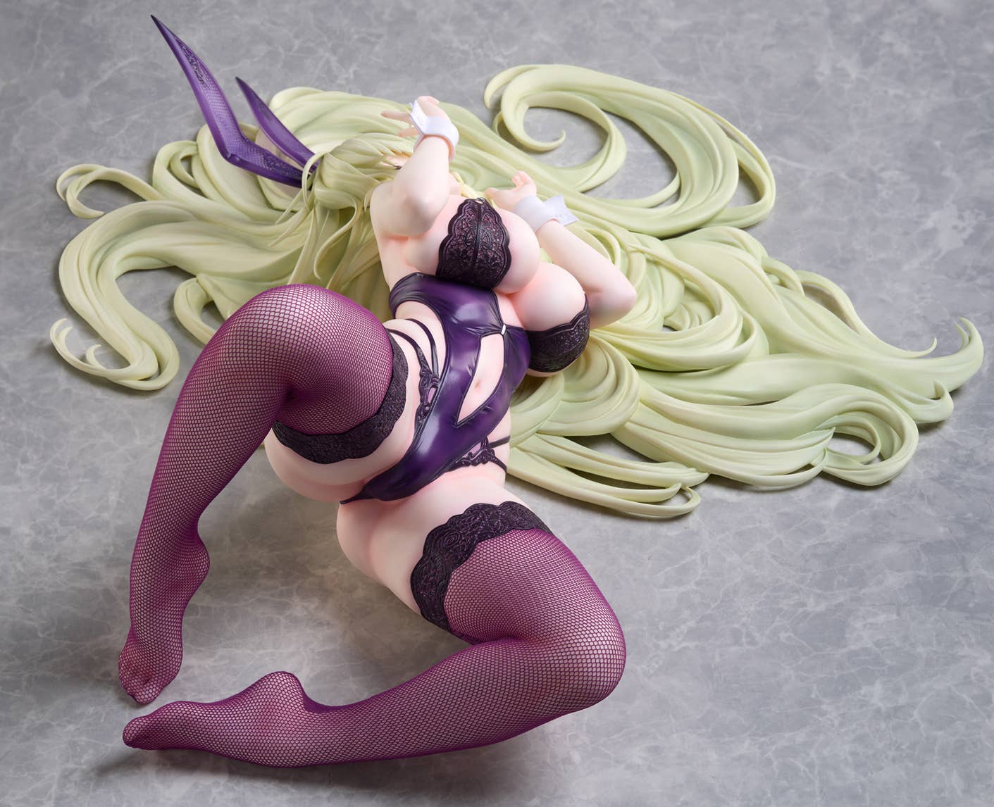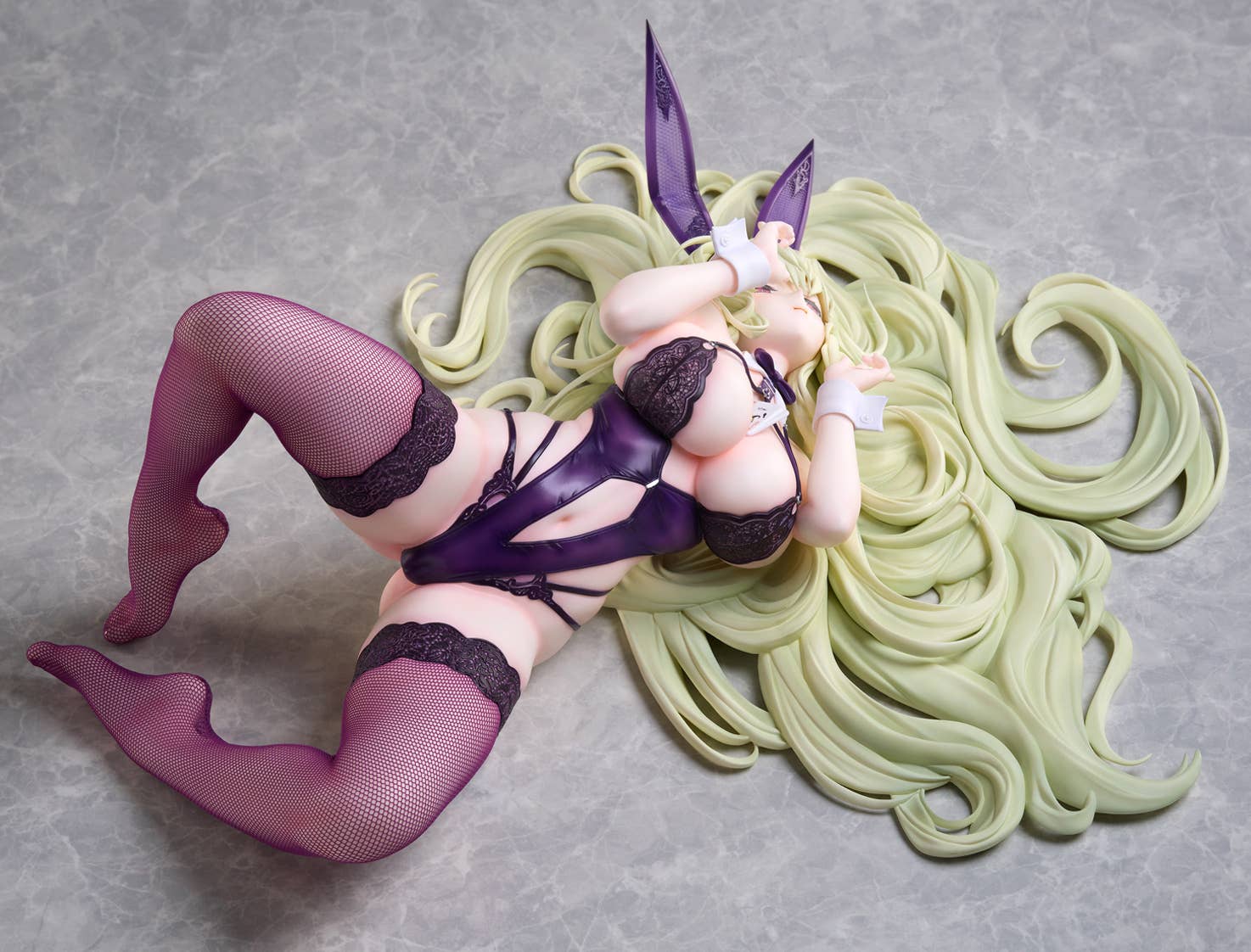 Napoli, a heavy cruiser from the popular mobile game "Azur Lane," gets a new "B-style" figure from Freeing in her "Dreamy Night" costume! She's reclining with her hair arrayed softly on the floor behind her, waiting for the Commander to sit with her and teach her card games! Her bunny-girl outfit is based on a lustrous purple color, and all the details are carefully crafted, such as the straps around her chest and waist, and the lace at the tops of her stockings. Her bunny ears have lace linings too. and she wears real fabric fishnet stockings in a special color to match the rest of her outfit. Her hair is softly shaded as well. Order her for your own collection today, Commander!