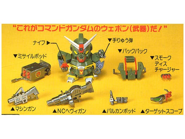 This re-release of the classic 1990 kit of BB Senshi Command Gundam comes molded in color and features simple snap-fit assembly. Upon completion, Command Gundam's spring-loaded machine gun and NC heavy gun can launch projectiles when the levers are pushed, while pushing the levers on the spring-loaded missile pod will shoot out four missiles. Go into Mega Bazooka Launcher mode by combining all three spring-loaded weapons with the backpack and launch a devastating attack! A sheet of foil stickers is provided for detail.