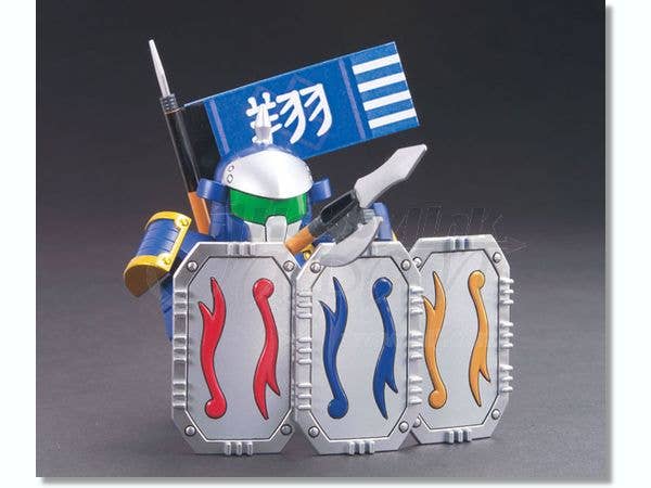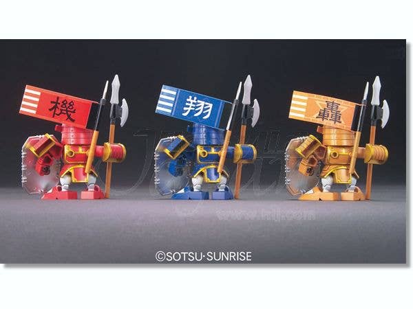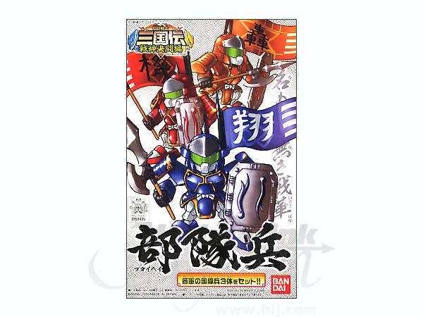 Build up your army of troops with this set that allows you to construct three ball-jointed kits of soldiers (molded in blue, orange, and red) from each of the three kingdoms (Giga, Gou, and Shou) in the "BB Senshi Sangokuden" series! Each soldier can be equipped with the included lance, shield, and flag spear with a paper flag for the respective kingdom. The snap-fit kits do not require cement but painting is necessary if you want them to look like the painted samples shown in the photo below and on the box.