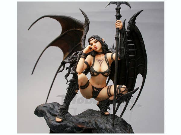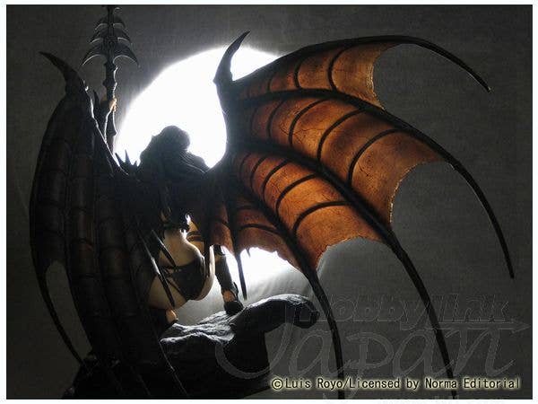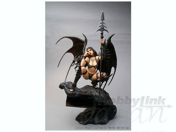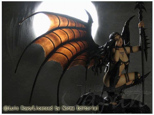 The newest example of Yamato's Fantasy Figure Gallery--bringing the talents of European and American fantasy illustrators and Asian sculptors together--is Black Tinkerbell! This stunning polyresin figure is based on the cover art of Luis Royo's art collection book "Visions." Sculpted by Shin Tanabe, she's not like any sweet little stardust-dispensing pixie you've ever seen--this slightly deadly faerie is armed, dangerous and very seductive! She pauses for a moment on a rocky outcropping, regarding you speculatively and holding her ferocious-looking spear propped in front of her. Check out those wings--they're made of slightly translucent material, and in a delightfully grotesque touch, you can even see a fine tracery of blood vessels in them when they're lit from behind! This gorgeous and moody piece will be 34cm tall after some simple assembly--but the end result is very much worth it! A certificate of authenticity and an illustration card are included. Limited to 3,000 pieces worldwide, this striking display is highly recommended, and deserves a place in your collection today! Please note that the photos shown are of a prototype; the production version may vary. Also, figures such as this are mass produced and as a result some inconsistencies in finish and painting may occur; these are not considered manufacturer's defects. If you absolutely must have perfection, prepare to do some touch-up work on your own.