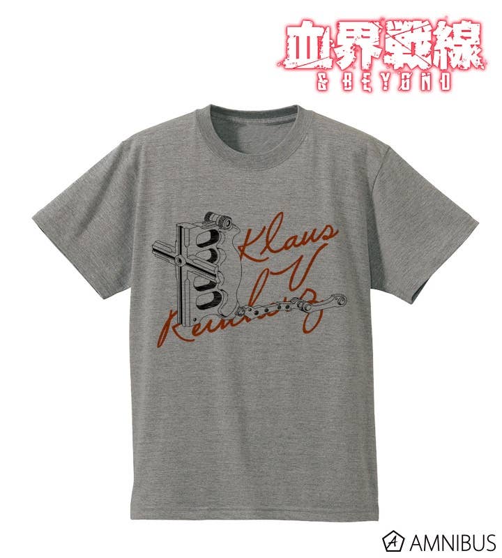 Show your support for Klaus Von Reinherz from "Blood Blockade Battlefront & Beyond", with this simple yet stylish grey t-shirt. Klaus is known for wielding cross shaped weapons to defeat his foes and here we have his signature knuckle duster on show. Arm yourself with this t-shirt and orders yours today!