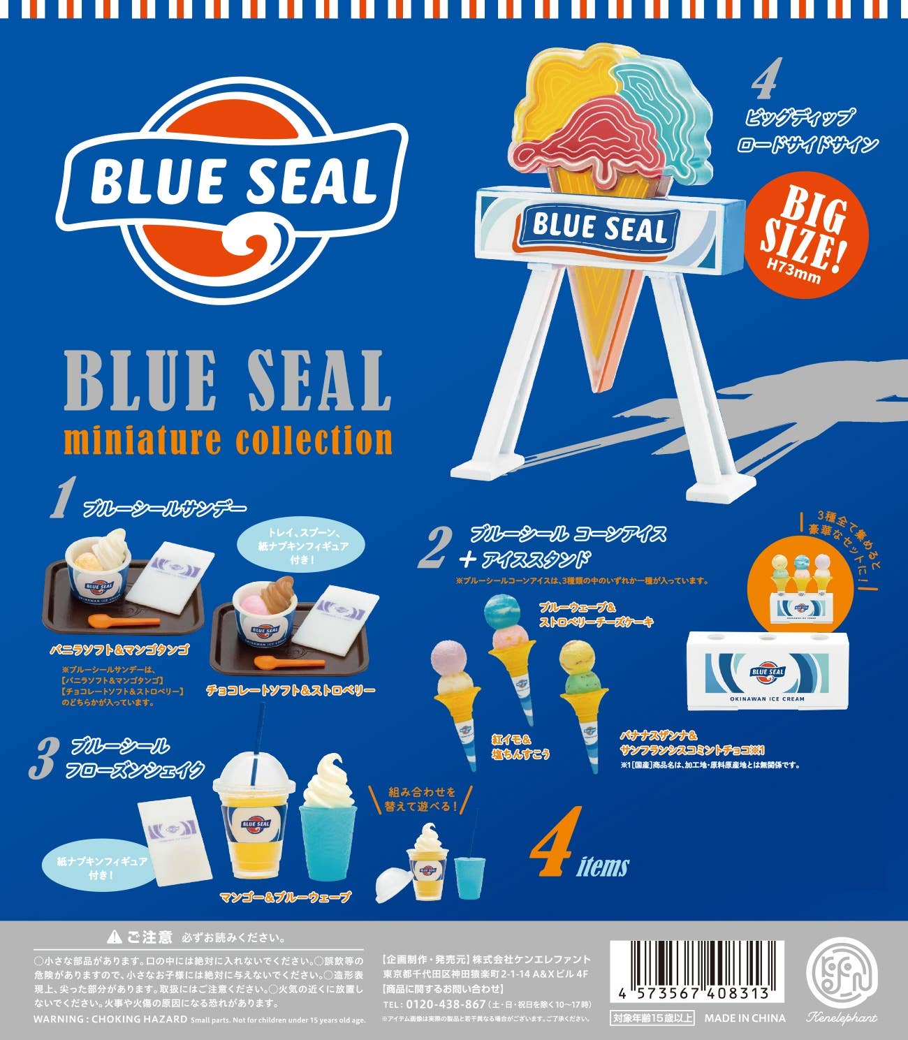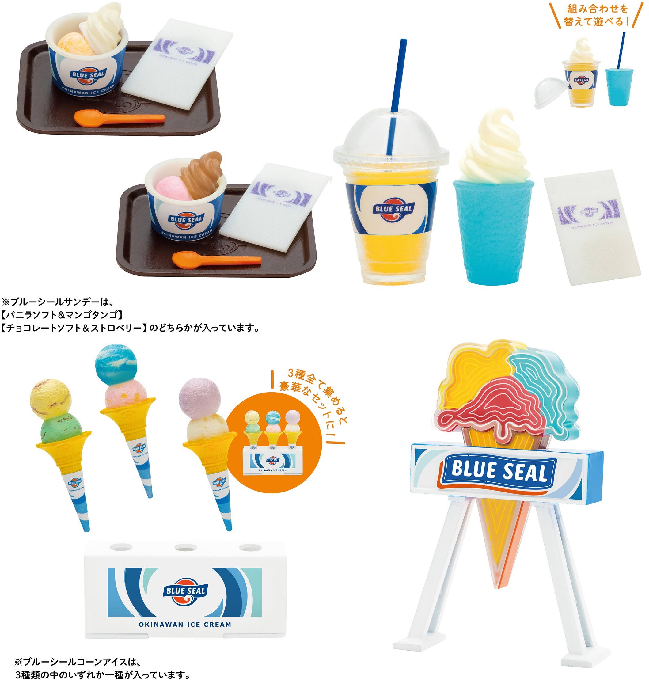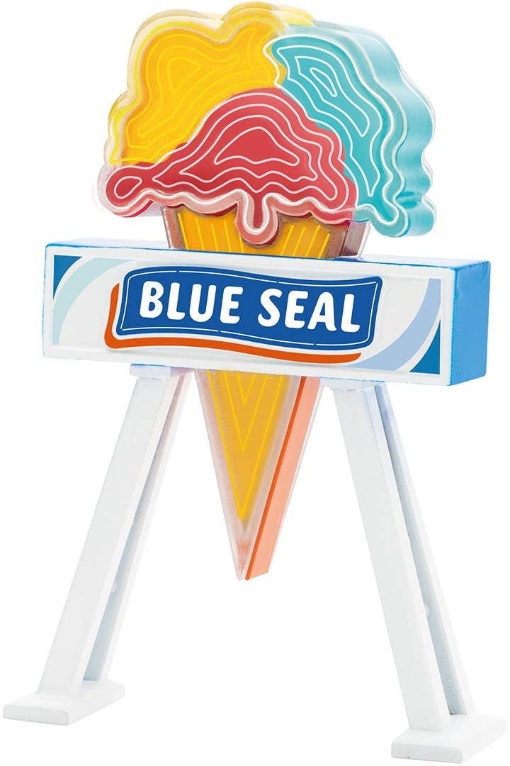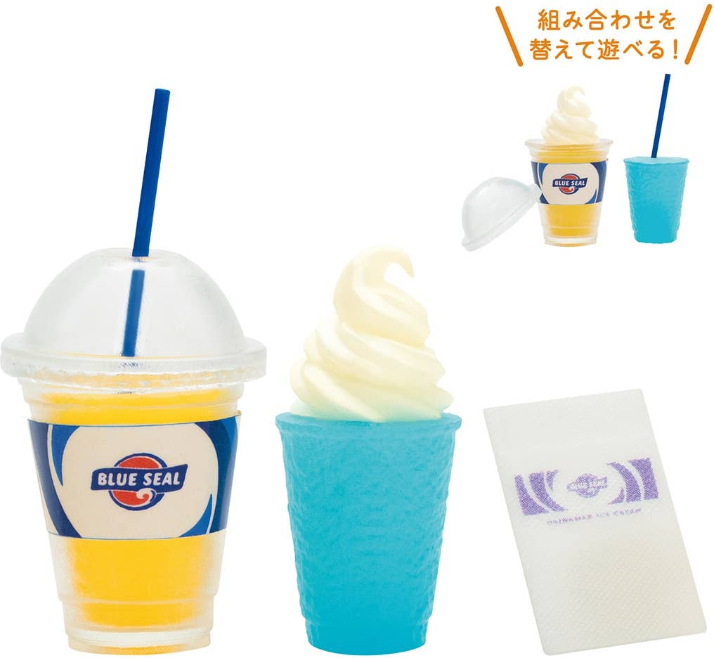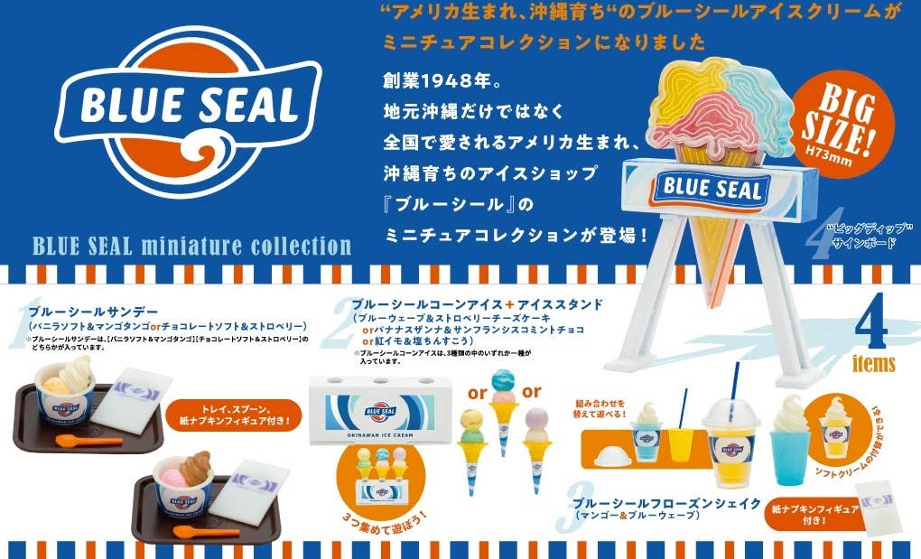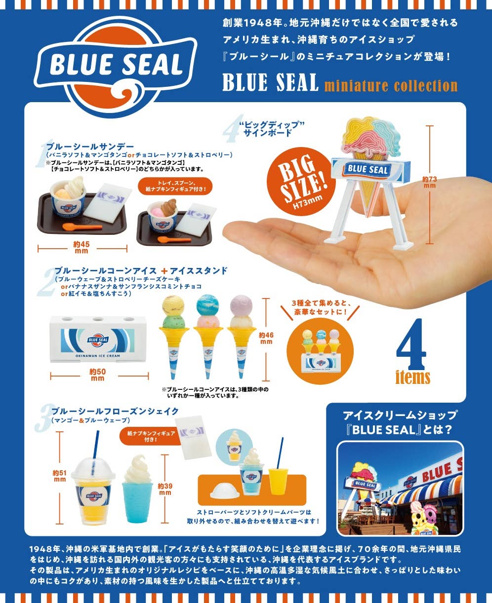 The Blue Seal ice cream shop was founded in the United States in 1948, and is especially loved in Okinawa, as well as all over Japan! This lineup of four different miniatures includes their iconic sidewalk sign. They're randomly packed in boxes of 12 -- order yours today!