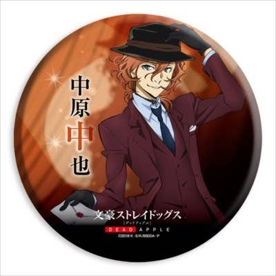This can badge from "Bungo Stray Dogs" features a brand new illustration of Chuya Nakahara! He's wearing a red suit and appears on an orange background.