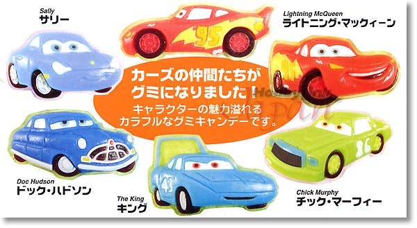 Here's an interesting product -- Gummy sweets of your favorite characters from Disney's Cars animated movie! This gummy series features Lightning McQueen, Chick Murphy, The King, Doc Hudson, and Sally. Each Cars soda-flavored gummy comes with a sticker.Please note that these are trading items, and are individually sealed and randomly packed by the manufacturer before shipment to HobbyLink Japan. As a result we are unable to honor requests for individual or specific items, nor can we promise you which one(s) you will receive in a pack. Please order only if you are willing to accept any of the possible types.