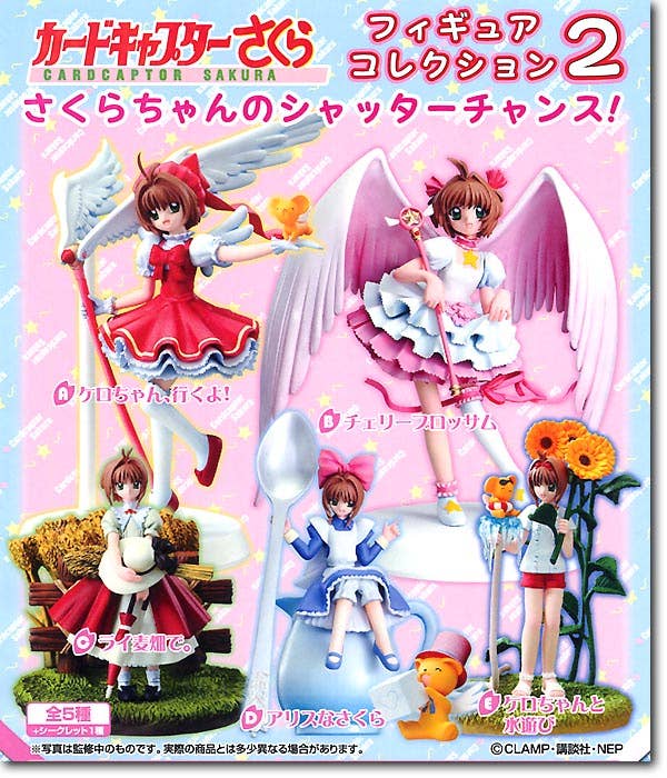 Beautiful little prepainted trading figures featuring Card Captor Sakura -- in various beautiful costumes and sometimes in just her own clothes! A total of six to trade and collect (five plus a secret one). Please note that these are trading figures and are individually sealed and randomly packed in boxes of 8 before shipment to HobbyLink Japan. As a result we are unable to honour requests for individual or specific figures, nor can we promise you which one(s) you will receive in a box. Please order only if you are willing to accept any of the possible types.