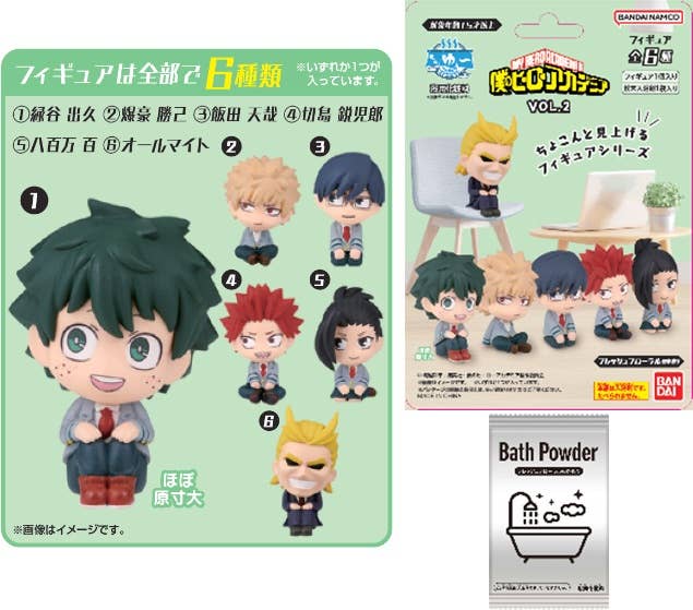 This fun item includes a randomly selected "Chara-Yu" series figure from "My Hero Academia," and a packet of bath powder! The bath powder will give your bath water a fresh floral scent; the figures are each in a seated pose, and are the perfect size to display anywhere! There are five different characters, and we'll randomly choose one for you. Order yours today!