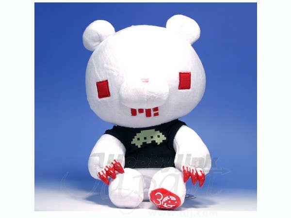 Commemorating the 30th anniversary of Taito's landmark Space Invaders game, here's an albino Gloomy Bear with embroidered-on square-pixel-like eyes, nose, and bloodstained mouth! This bloody-clawed plush bruin measures about 26cm from rump to eartip in his sitting pose. A collector's item of a game prize from Taito!