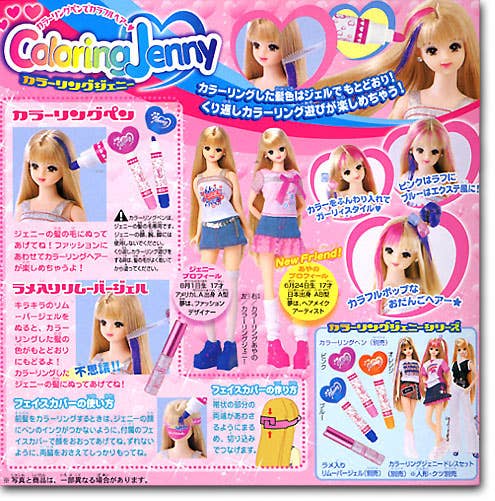 Jenny is ready for you to colour her hair! She comes with two colouring pens for dying her hair, a tube of removal gel (for taking the colour out), two hair ties, a hairbrush, pair of shoes, and a face cover (to keep her face safe and clean when you're colouring her hair. Do not use the hair colour on your own hair!