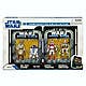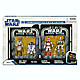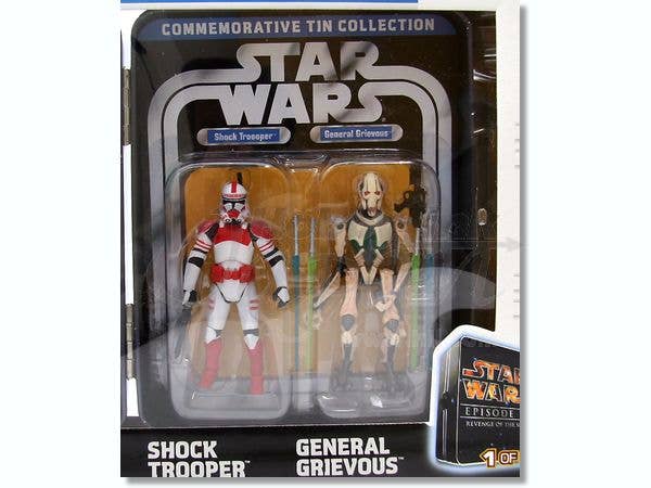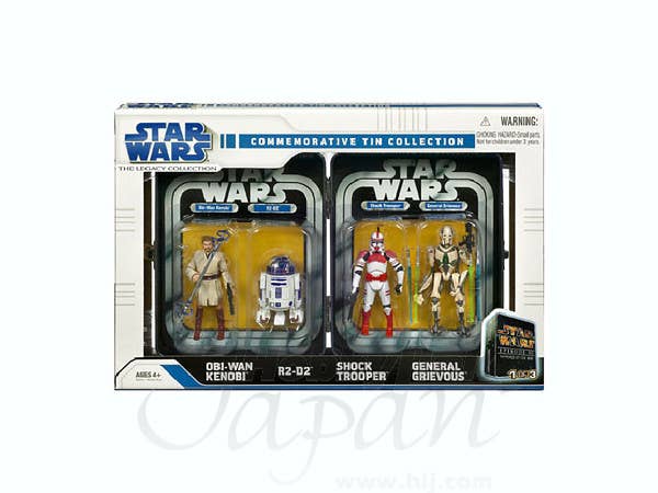 This amazing set was produced by Hasbro in 2008, and has a Tomy Direct label on the box to sell it in Japan. What a deal--you get four action figures and a commemorative tin box with fantastic movie-poster artwork! The tin box measures 15cm by 19.5cm by about 8 cm closed, and features a lunchbox-style clasp to close it. Packed inside are carded figures representing four of the pivotal characters from "Revenge of the Sith": Obi-wan Kenobi, R2-D2, a Shock Trooper, and General Grievous. What a great nostalgic gift for someone special!