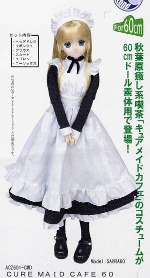 Sweet black-and-white "Cure Maid Cafe" waitress uniform, complete with pinafore, stockings, and frilly headband. Shoes are not included. Designed for Azone's 60 cm dolls and not guaranteed to fit dolls of other manufacturers. The doll and her shoes on the image does not include.