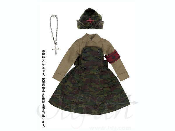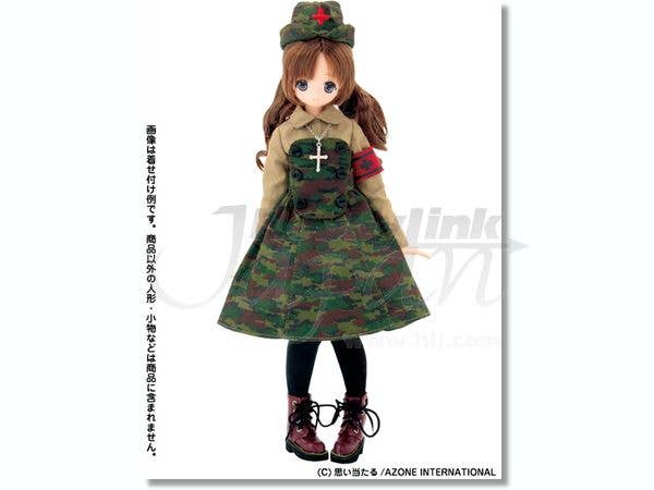 This adorable set allows your Pure Neemo doll to cosplay as a sweet and nurturing military-style nurse! Included is the long-sleeved khaki-beige blouse with red armband, a camo-print corset-style dress, a matching cap, and a cross necklace. (The stockings, shoes and doll shown are not included.) Made to fit Azone's 23.5cm Pure Neemo dolls and may not fit dolls by other manufacturers.