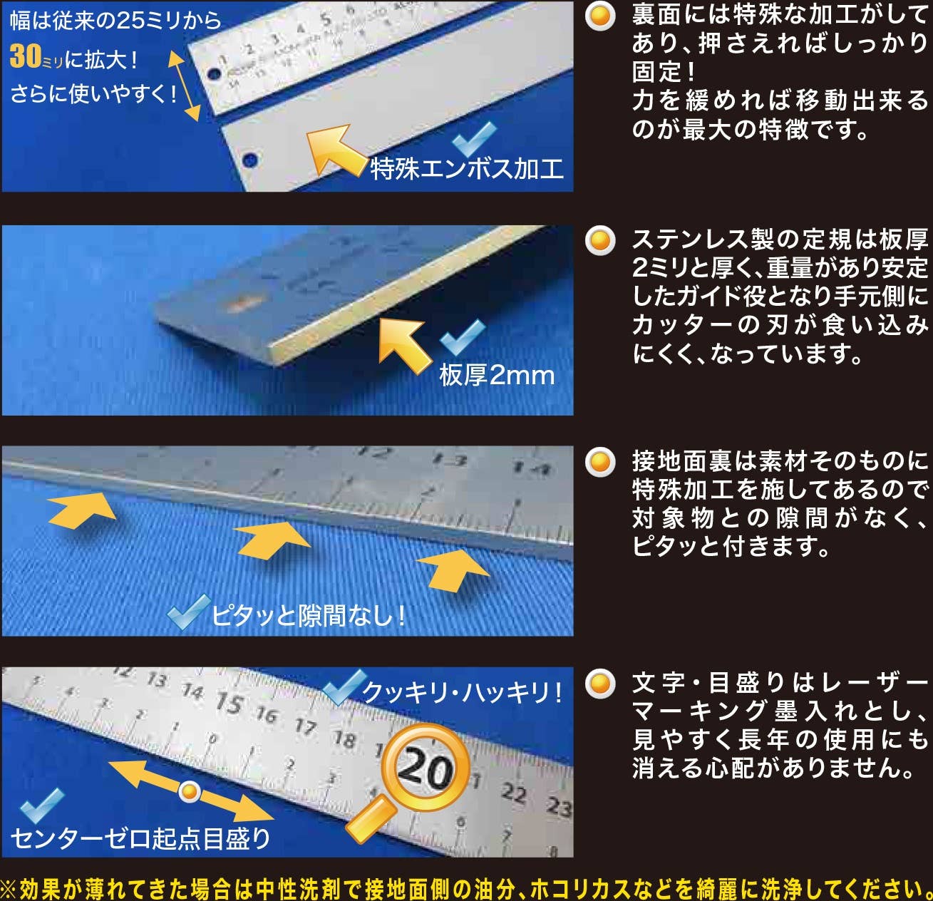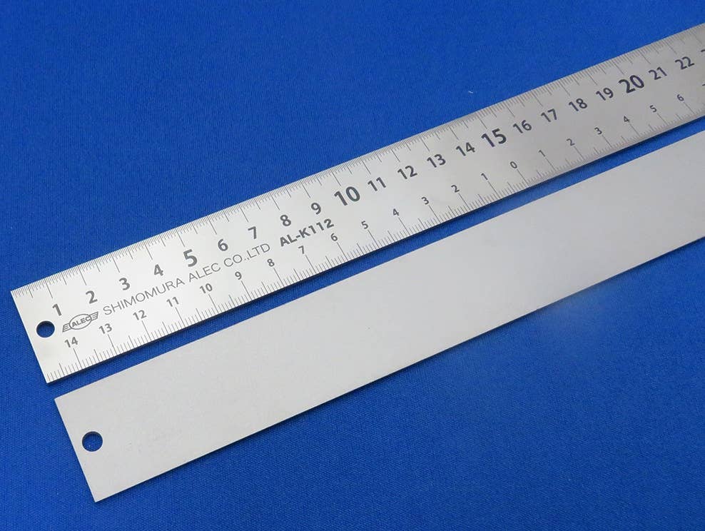 The back of the ruler features a special processing to keep it from slipping on cutting mats, wood, vinyl, paper, masking tape, and other surfaces. Just put a little bit of pressure on it, and there's no worry of the ruler sliding around during use. It's made of stainless steel with a thickness of 2mm, making it nice and hefty and stable during use as well.