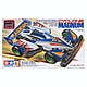 These great little mini 4WD car kits feature snap assembly (no glue required); they're molded in colored plastic and include stickers for marking (so no paint is required). Rubber tires are included as well. Required is a 130 type motor, and 2 AA (UM3) type batteries (not included). This is the Cyclone Magnum, molded in white and black, with a black chassis, and bright green wheel hubs. These Fully Cowled Mini 4WD are intended for racing specifically on Tamiya's racing circuits.