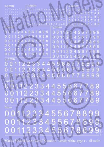This is a set of number decals, from 1mm to 6mm in size. With 8 sizes to choose from, they can be adapted to just about any scale model!