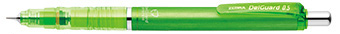 This amazingly designed mechanical pencil features a two-part system to prevent the lead from breaking while you're writing! A spring in the barrel of the pencil allows the lead to move back into the pencil with too much vertical pressure; too much sideways pressure will trigger another spring to automatically extend the lead guard. Features a smooth light-green plastic barrel, and comes with an 0.5mm lead.