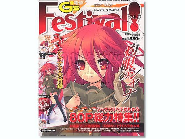 Volume eight of all-color Dengeki G's Festival magazine spotlights "Shakugan no Shana" with the entire issue dedicated to its anime and manga series, movie, game, illustrations, and merchandise, along with a special interview with seiyuu Rie Kugimiya and Satoshi Hino. A special box containing a Shana pass case, a 155cm x 50cm Shana pillow cover, and a Shana mobile phone cleaner is included.