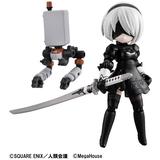 2B (YoRHa No. 2 Type B) from "NieR:Automata Ver1.1a" joins the "Desktop Army" series from MegaHouse! The stylish atmosphere of the anime is recreated with a completely new body! Her two swords, White Contract and White Promise, are pre-painted parts that can be mounted on her back using the included clear parts. Pod 042 is also included, and is equipped with 3mm-diameter holes and 3mm general-purpose hard points, so you can recreate your favorite scenes from the show and enjoy playing around with weapons! Built-in hard points common to the "Desktop Army" lineup ensure full compatibility with other items in the series -- the weapon combinations are endless! Let 2B help protect your desktop -- place your order today!