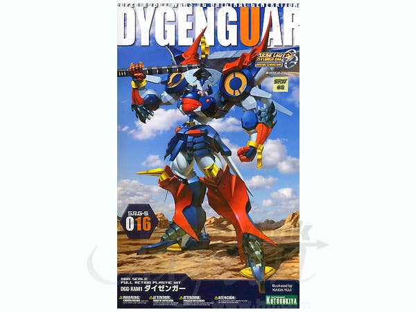 Kotobukiya's popular Dygenguar kit first released in 2007 is back by popular demand, with everything remaining the same except for added text elements on the box art. Piloted by Sanger Zonvolt, Dygenguar has a design reminiscent of a fully armored samurai warrior, which perfectly suits the pilot's personality! The super robot is sharply detailed and will stand 21cm tall with fully articulated polycapped joints upon completion. Two types of swords, the giant broadsword and katana, are included. Parts come molded in color and its face is prepainted. Don't miss out on another opportunity to build this superb mech!