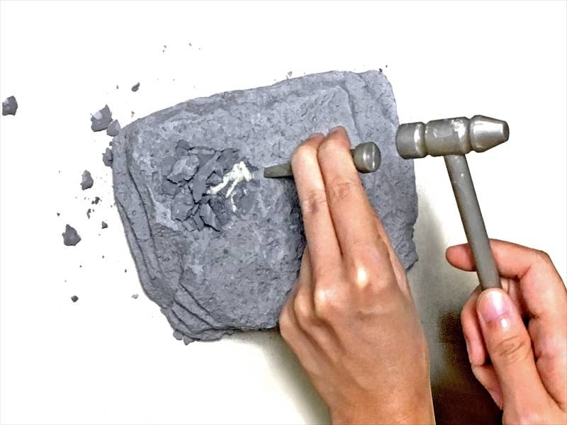Here's a simulated fossil excavation experience that you can enjoy at home! Crush the rocks (plaster) using the included tools, then excavate the fossils, brush them to clean them up, and assemble the bones! This results in a skeleton model with a total length of about 30cm that you can display with pride! Order yours today!